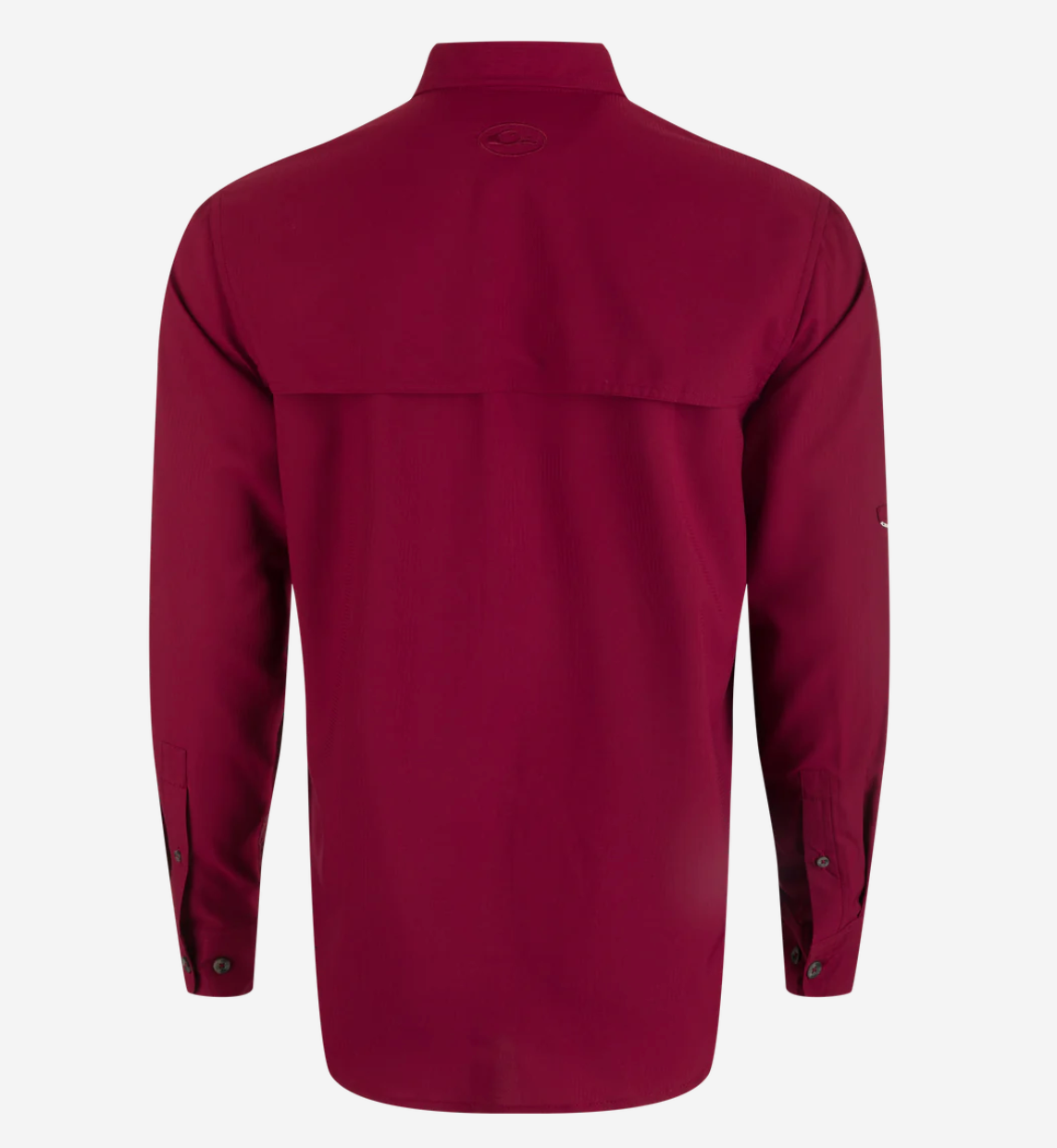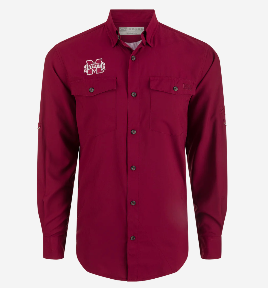 Hail State in the Drake Frat Dobby. The Frat is made from 100% polyester with a dobby texture. The performance fabric is featherweight at 79 GSM which allows moisture to wick quickly from the body. It also has a UPF30 rating for sun protection for those September afternoons in Davis Wade. It has a natural stretch for ease of movement, a classic fit, a hidden button-down collar, two button-through flap chest pockets, and a vented cape back. It has a sculpted hem which allows you to wear tucked or untucked and has an adjustable tab if you want to roll up your sleeves. Classic styling and technical features put The Drake Frat Dobby in a class by itself.
