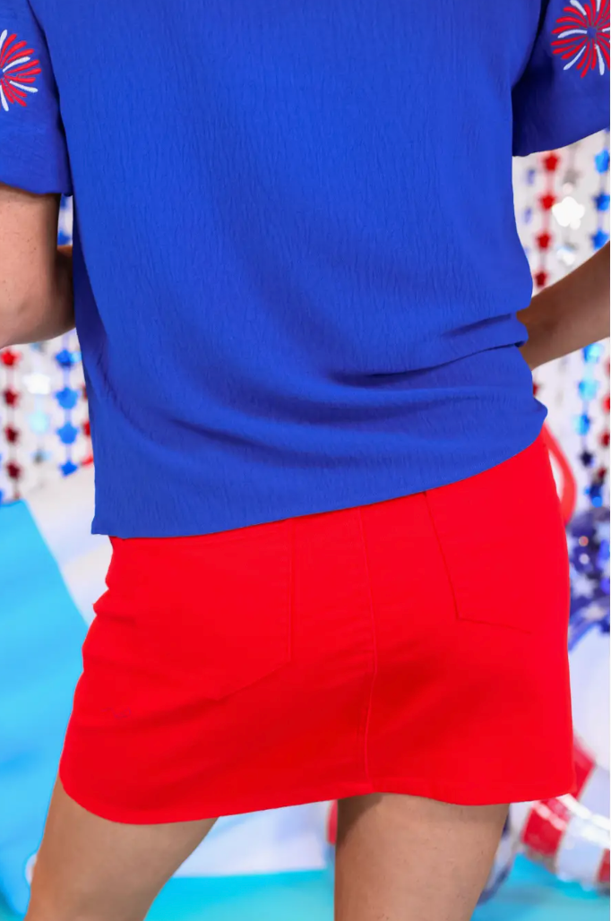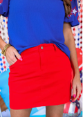Get this style that is the perfect everyday essential! Made from soft red denim fabric with a touch of stretch and a classic look.