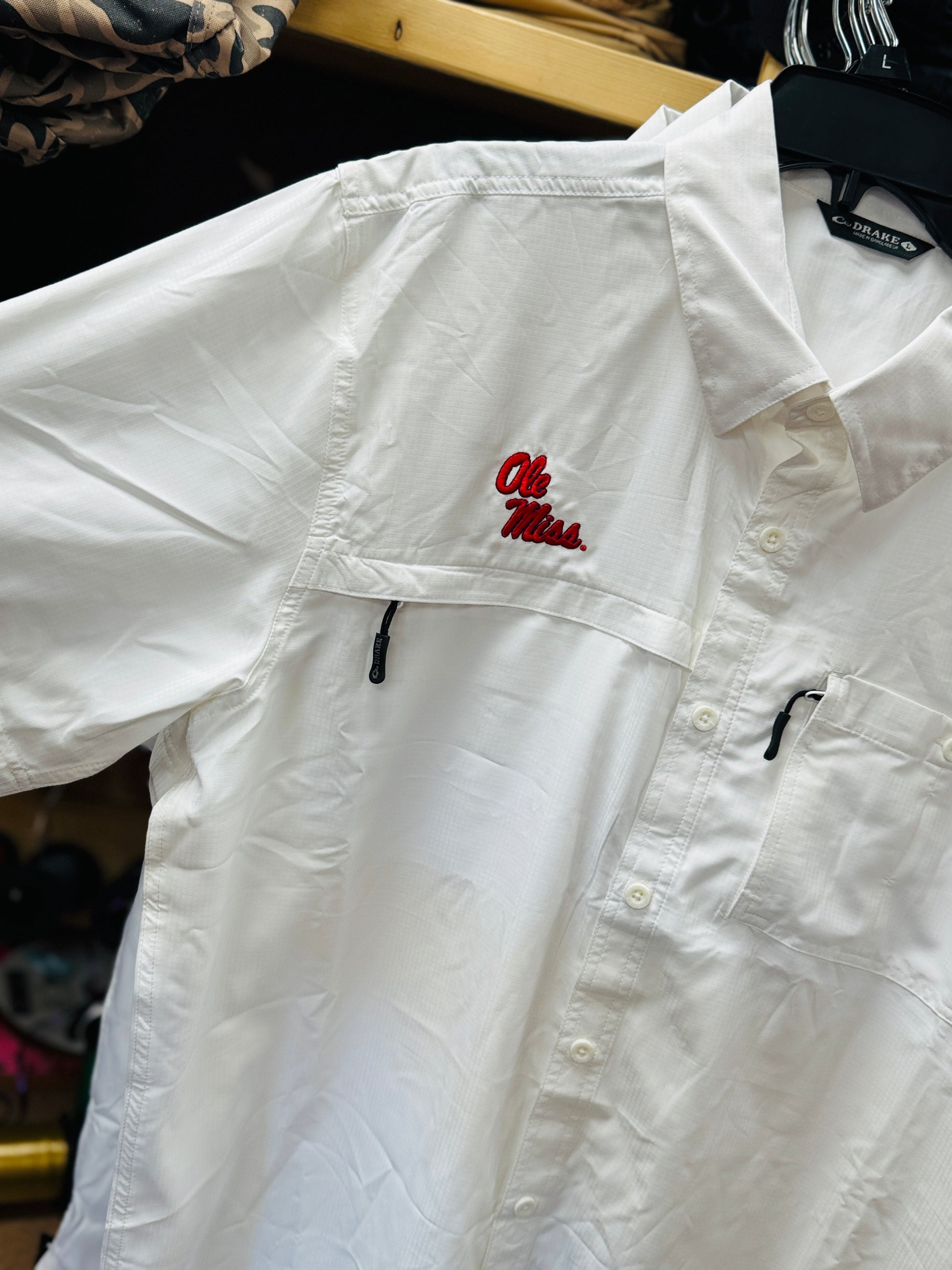 The Ole Miss 8-Shot Shirt is made from a lightweight Dobby fabric in solid and camo. The performance fabric is featherweight at 71 GSM which allows moisture to wick quickly from the body. It also has a UPF30 rating for sun protection and has a natural stretch for ease of movement. This shirt has a classic fit, a hidden button-down collar, and a vented cape back. It features a right chest pocket with a horizontal hidden zipper and a button through the left chest pocket with a hidden vertical zipper. It has a split tail hem which allows you to wear tucked or untucked. Classic styling and technical features will make this shirt one of your soon-to-be favorites.