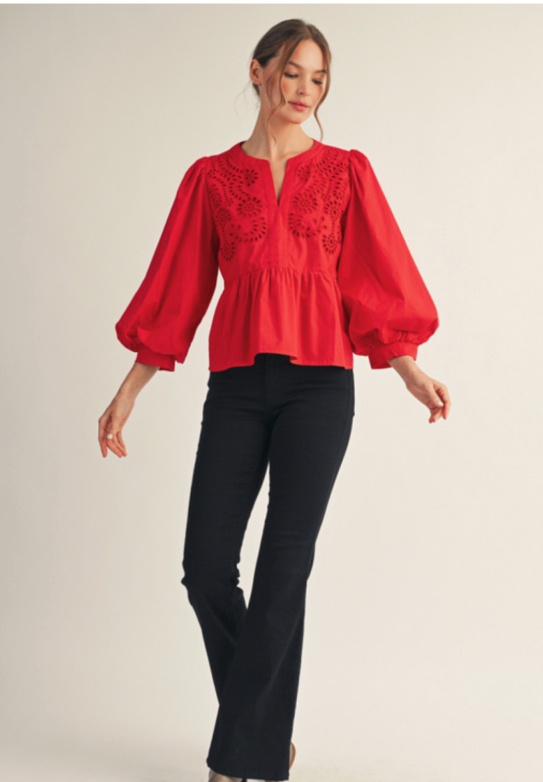 Elevate your wardrobe with this stylish peplum top featuring flattering 3/4 puff sleeves and delicate eyelet accents. Designed to enhance your silhouette, it offers a perfect blend of feminine charm and modern flair, making it ideal for both casual outings and dressier occasions. Experience comfort and elegance in one versatile piece.
