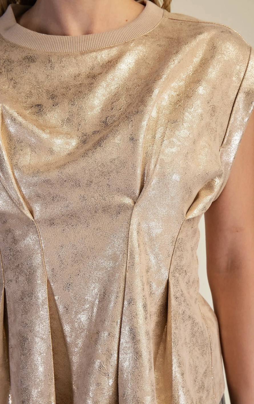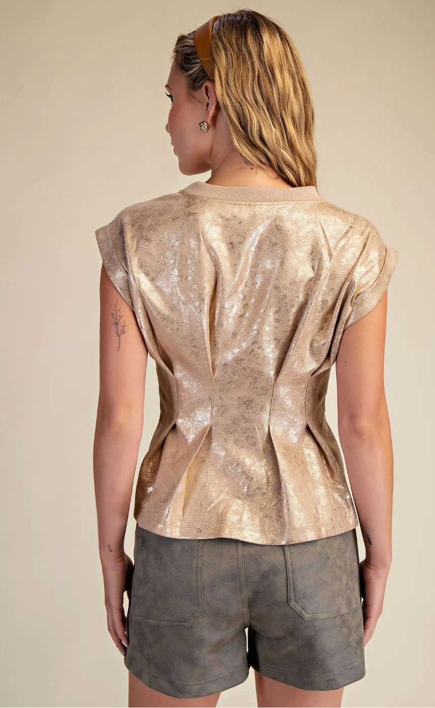 Elevate your wardrobe with the Pure Elegance Metallic Top. Featuring a lustrous metallic finish, this top effortlessly adds a sophisticated shimmer to any outfit. Its sleek design offers a flattering fit that highlights your silhouette, making it perfect for both evening events and stylish daywear. Experience comfort and elegance combined in one striking piece.