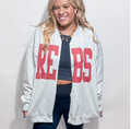 REBS CARDIGAN OLE MISS Game Day Comfy- Oversized sweater Oversized print ** Size up 1-2 sizes for an oversized fit ** Model is 5'5" and wearing a XL for an oversized fit ** Raw Edge Sublimation Ash Gray Gildan Sweatshirt 50/50 cotton/polyester
