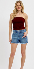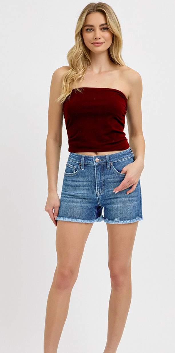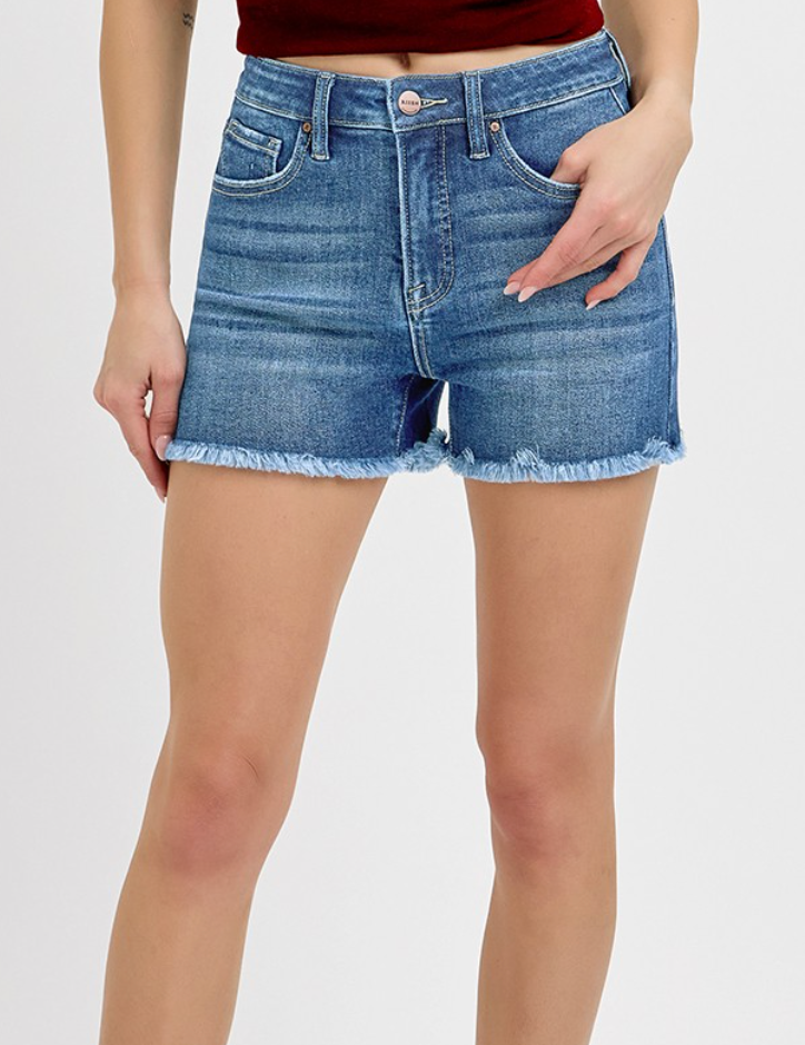Boost your confidence and look stylish in our Tummy Control High Rise Fray Hem Shorts. Featuring a flattering 10 1/2" rise and 3 1/2" inseam, these shorts provide tummy control while still being on-trend with a frayed hem. The model, standing at 5'8" with a waist of 25" and hips of 35", is wearing size S for a perfect fit. Elevate your summer wardrobe with these must-have shorts!