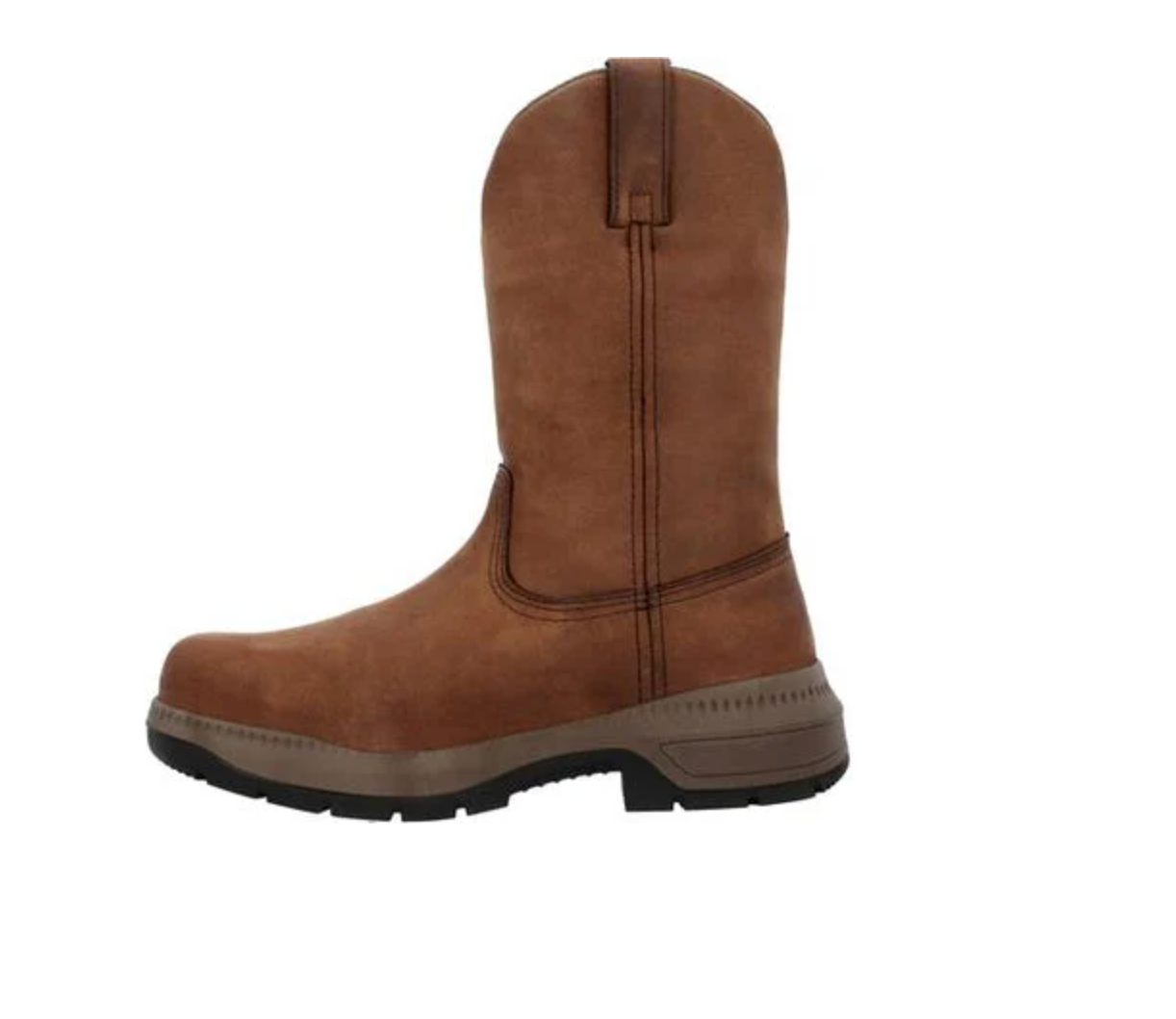 Ready to take on the day, this rugged 11” pull-on composite toe work boot is prepared for anything. Tackle any job with waterproof full grain 2.0mm crazy horse leather and a direct attached oil- & slip-resisting rubber outsole with a PU midsole. Wet and oil spilled environments are no match for this boot with all around waterproofing by Rocky, guaranteed to keep your feet dry and protected when you need it most. Our Rocky® Air-Port Lite® Sponge PU Footbed with memory foam is a high-performance, cushioning and comfortable footbed that will keep you on your feet until the job is done. Built to last with the help of a fiberglass shank for added support giving you a stable platform that helps reduce foot fatigue and discomfort. This boot meets ASTM F2413 protective toe and electrical hazard standards.