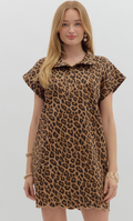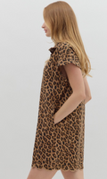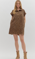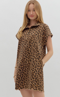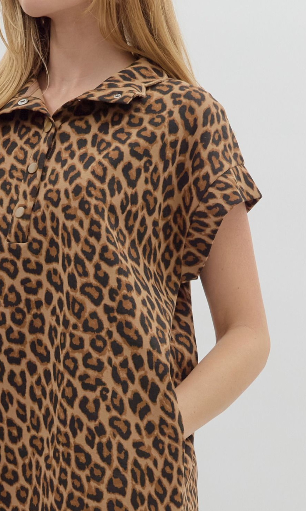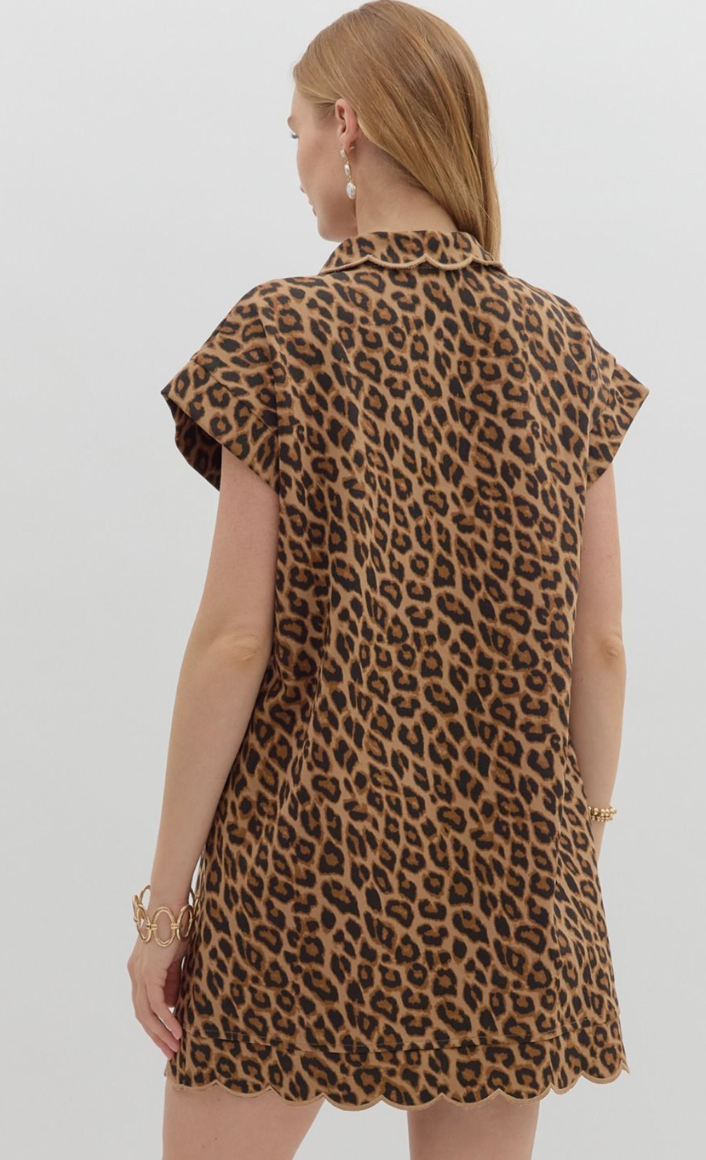 This leopard print cuff band mini dress combines bold style with delicate details. Featuring an embroidered scallop hem and a high-neck snap button closure, it offers a chic, polished look. Lightweight knit fabric ensures comfort without sheerness, while side pockets add practical convenience. Unlined for a breathable fit, this dress is perfect for making a confident statement wherever you go.