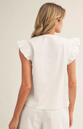 Elevate your everyday wardrobe with this charming ruffle-sleeve button-down top. The square neckline creates a flattering, modern silhouette while delicate scalloped edging along the buttons adds an unexpected touch of sophistication. Crafted in a versatile solid hue, this piece transitions seamlessly from casual weekends to polished workdays. The ruffled cap sleeves bring playful dimension and movement, making it a standout choice for anyone seeking timeless style with contemporary flair.