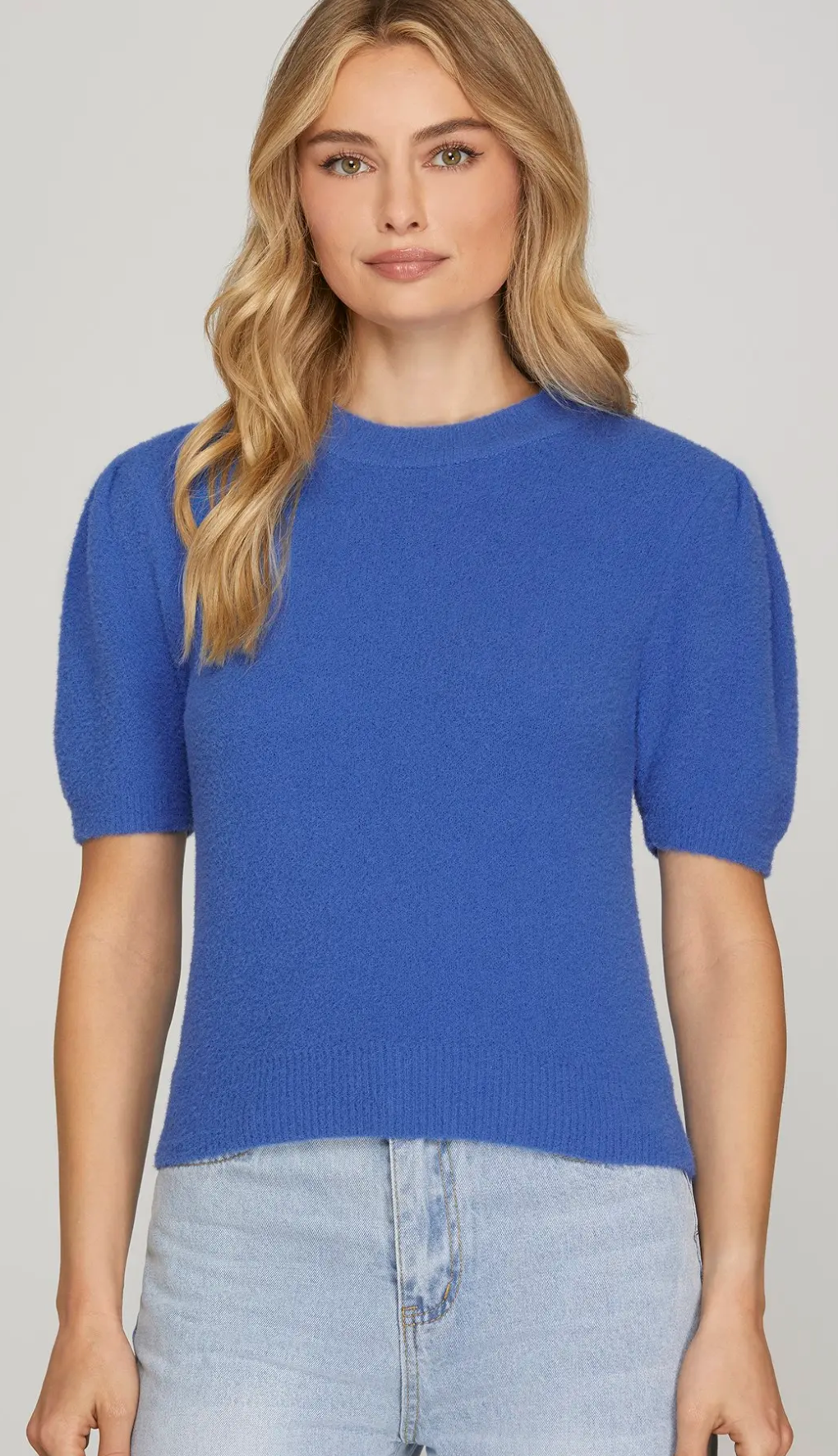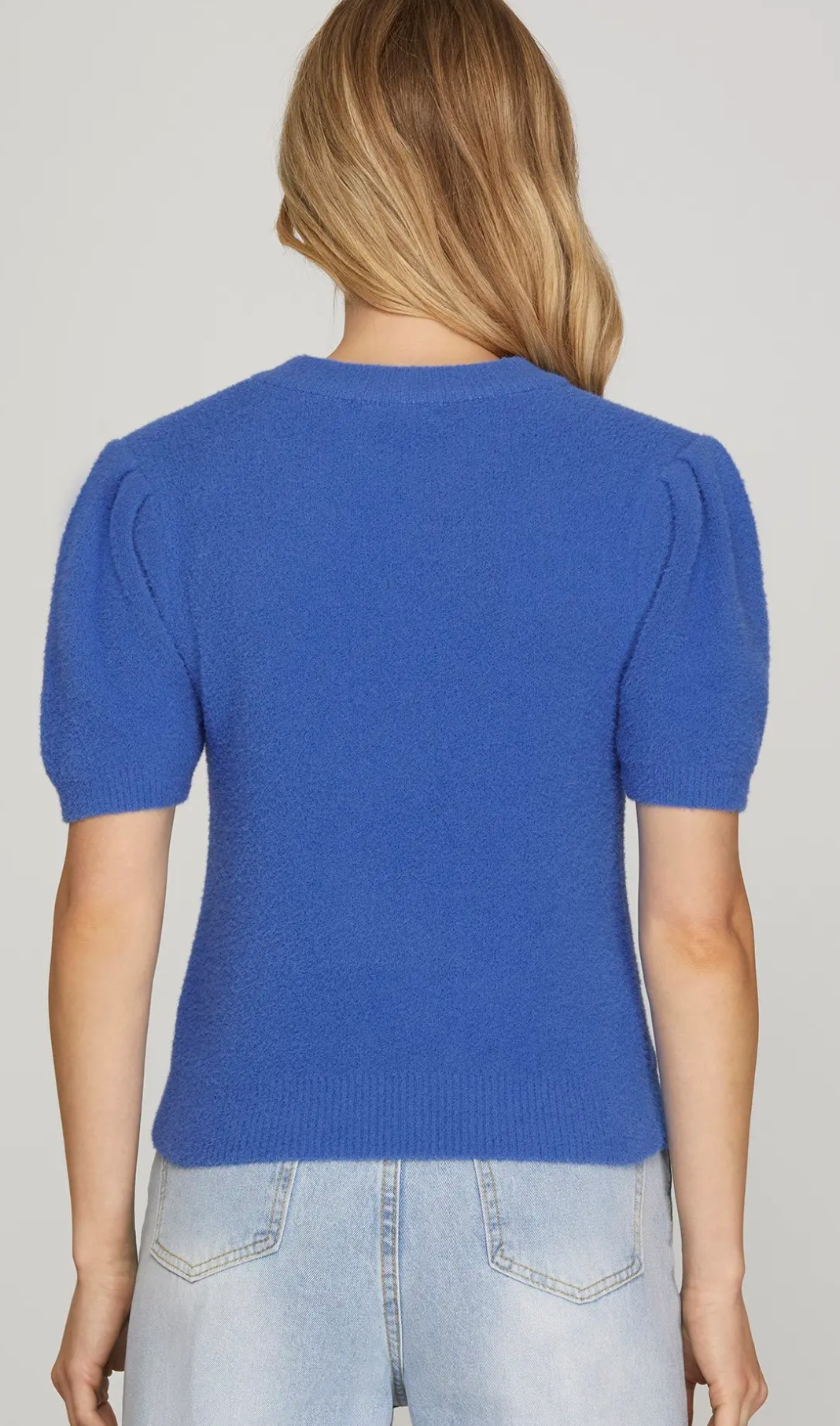 This short sleeve round neck sweater top combines comfort and style effortlessly. Its soft fabric ensures a cozy fit, while the classic round neck adds a timeless touch. Perfect for layering or wearing on its own, this versatile piece will elevate your everyday wardrobe with ease and elegance.