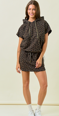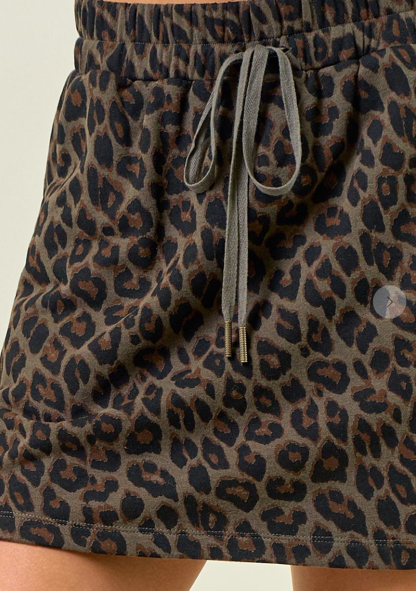 This mini skirt features a striking leopard print paired with soft terry fabric for comfortable wear all day. Its flattering shirt tail hem adds a stylish flair, while the adjustable drawstring tie at the waist ensures the perfect fit. Stand out effortlessly with this trendy and versatile piece.