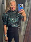 Elevate your wardrobe with this stunning hunter green top that seamlessly blends sophistication with bold style. The rich jewel tone serves as the perfect canvas for an eye-catching metallic gold and black leopard print that adds instant glamour and personality to any outfit. Whether you're dressing up for a night out or elevating your everyday look, this versatile piece transitions effortlessly from casual to chic. The striking print catches the light beautifully, ensuring you'll turn heads wherever you go. Perfect for those who refuse to blend in and want to make a confident fashion statement.