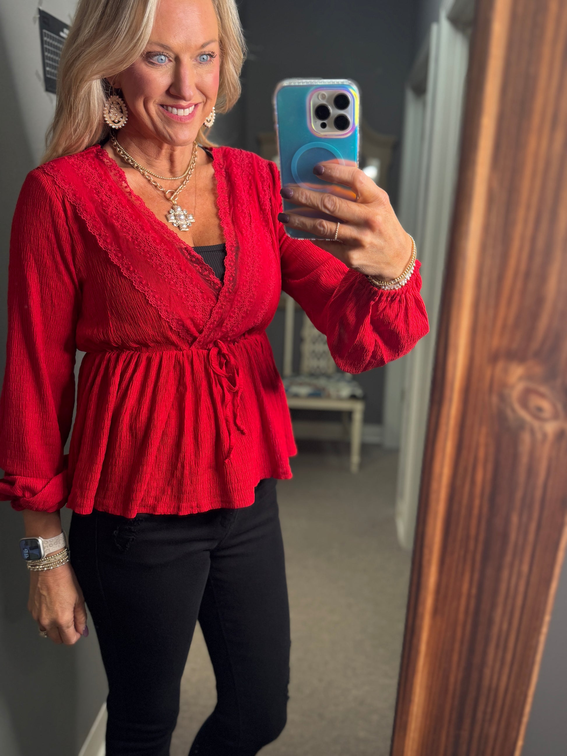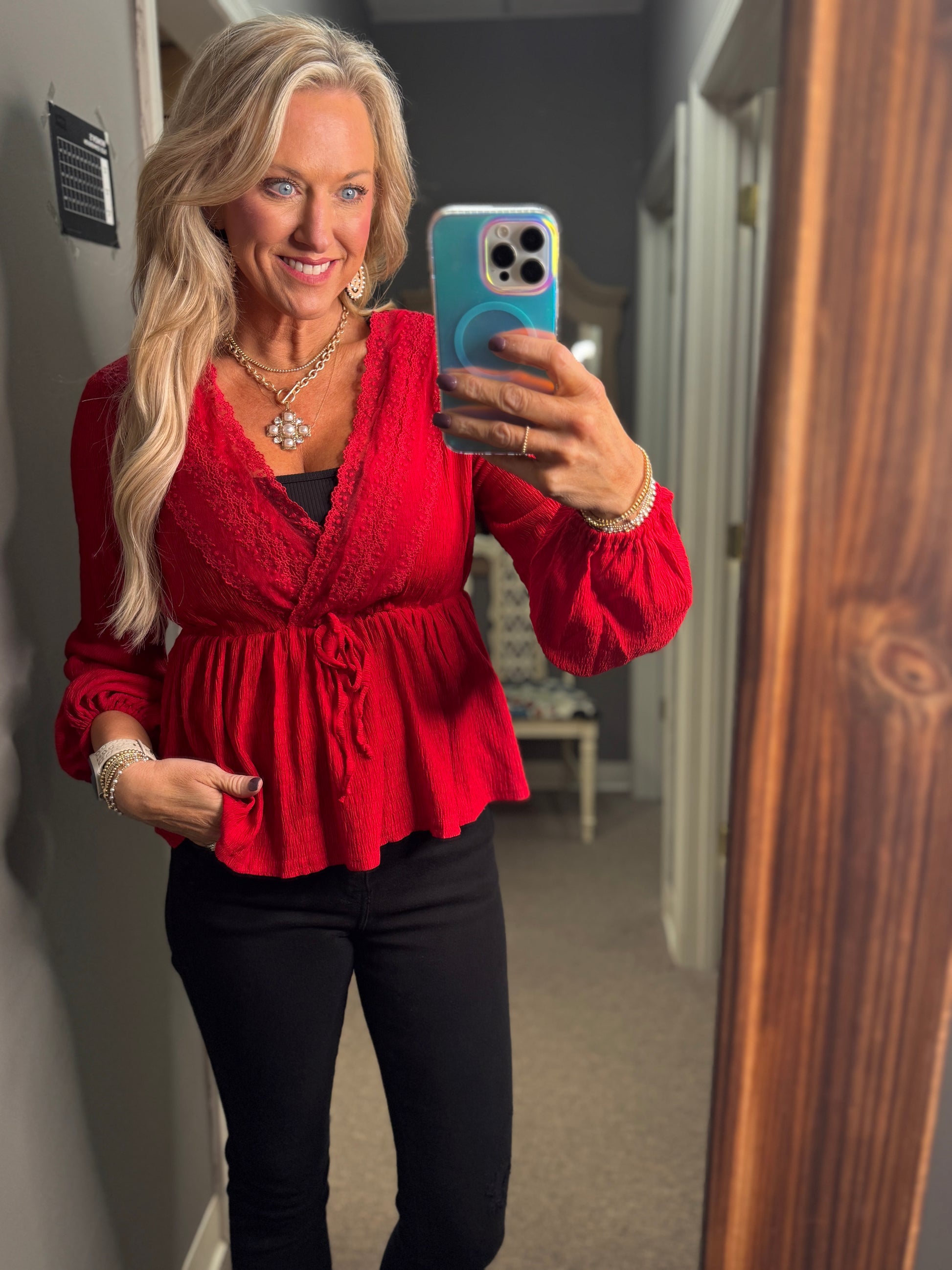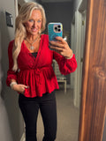 Elevate your wardrobe with this elegant blouse featuring a delicate lace-trimmed V-neckline and a flattering peplum waist. Crafted from soft, textured fabric, it offers long, loose-fitting sleeves with cinched cuffs for comfortable sophistication. Pair it effortlessly with leather skirts or pants to create a stylish, feminine ensemble that turns heads wherever you go.