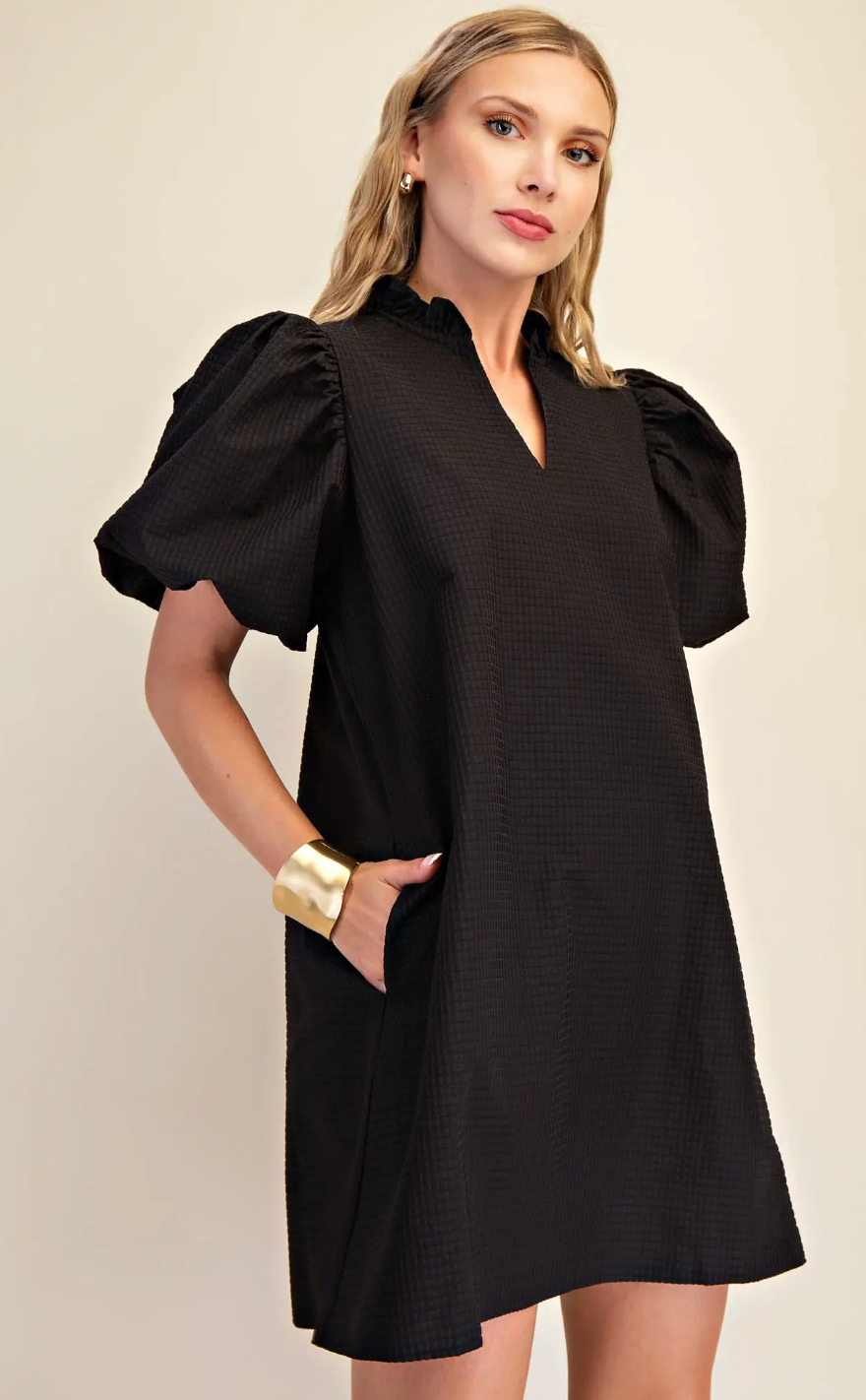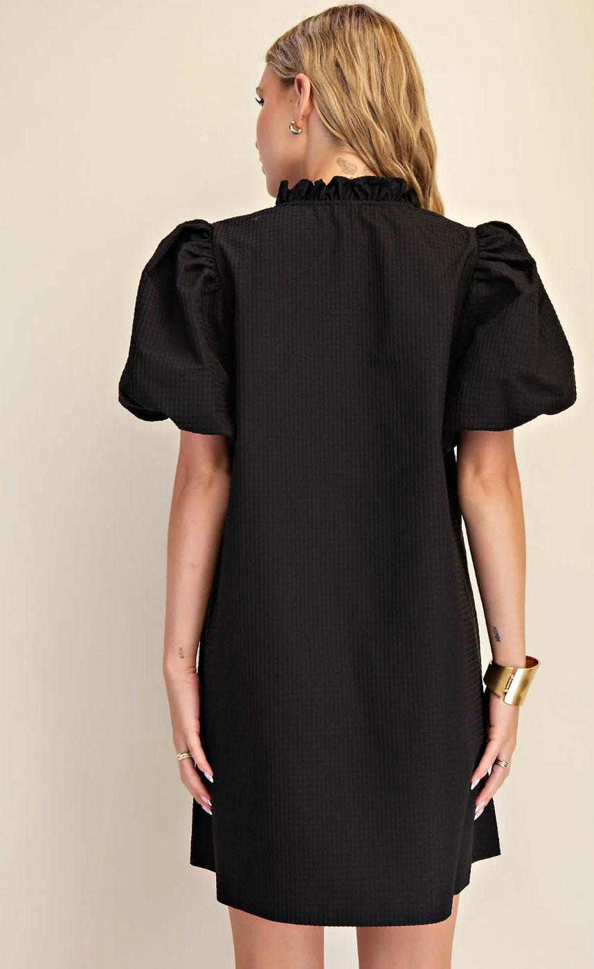 Elevate your style effortlessly with this Textured Ruffle V-Neck Puff Sleeve Mini Dress. Its delicately textured fabric adds dimension, while the ruffled V-neckline and puff sleeves create a charming, feminine silhouette. Perfect for day-to-night occasions, this mini dress combines playful elegance with comfortable wear, making it a standout choice for any wardrobe.
