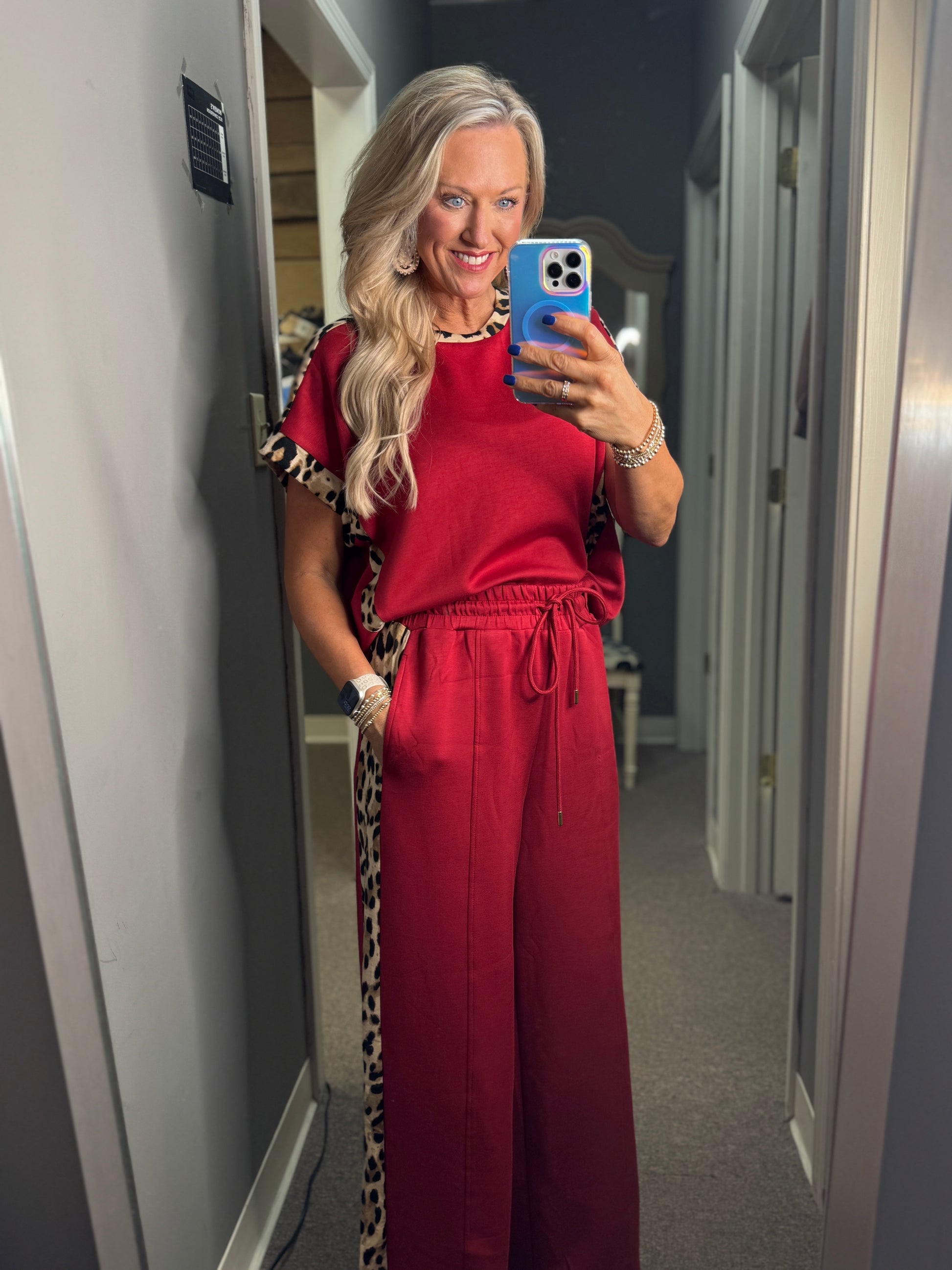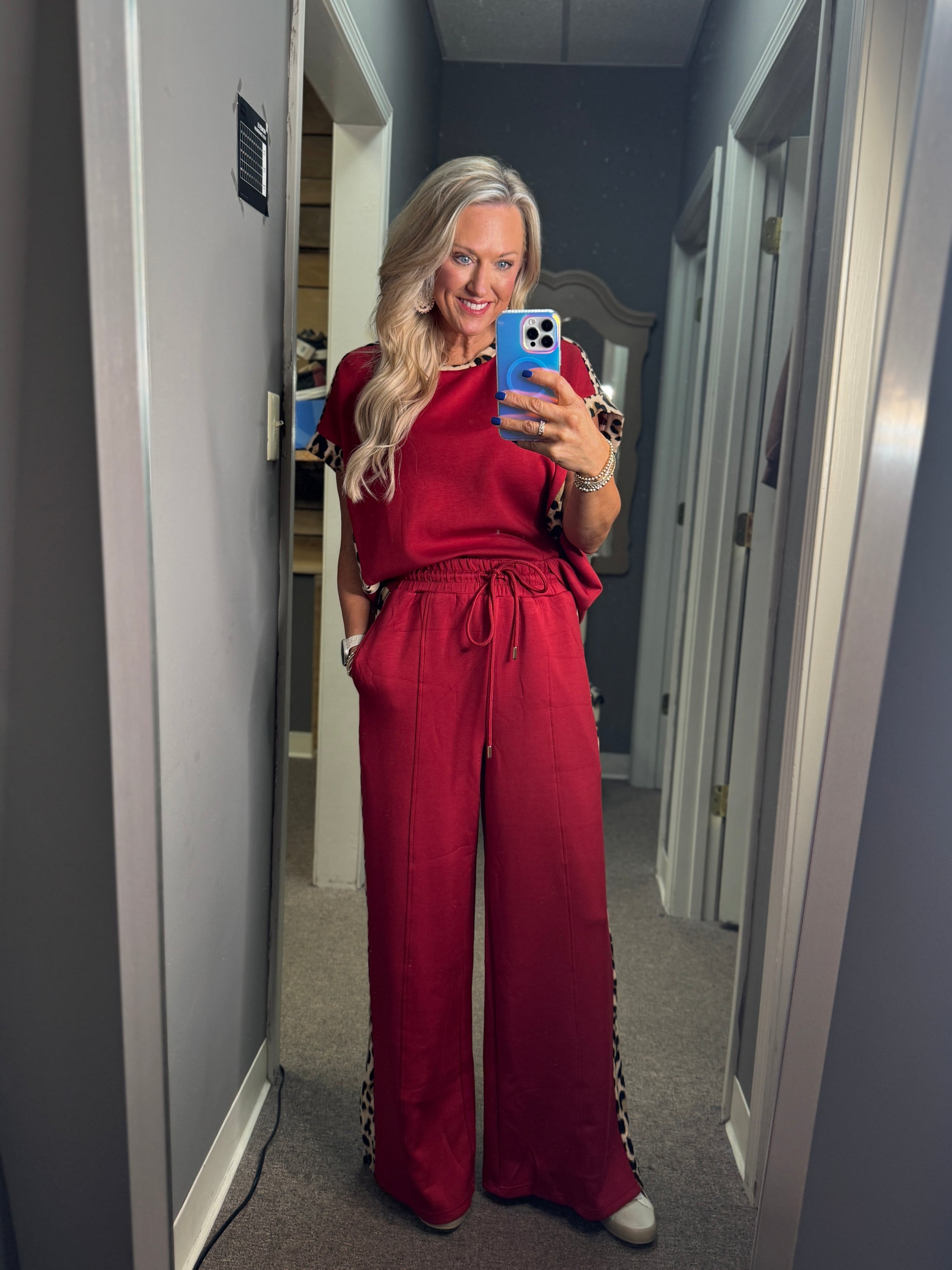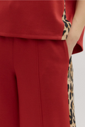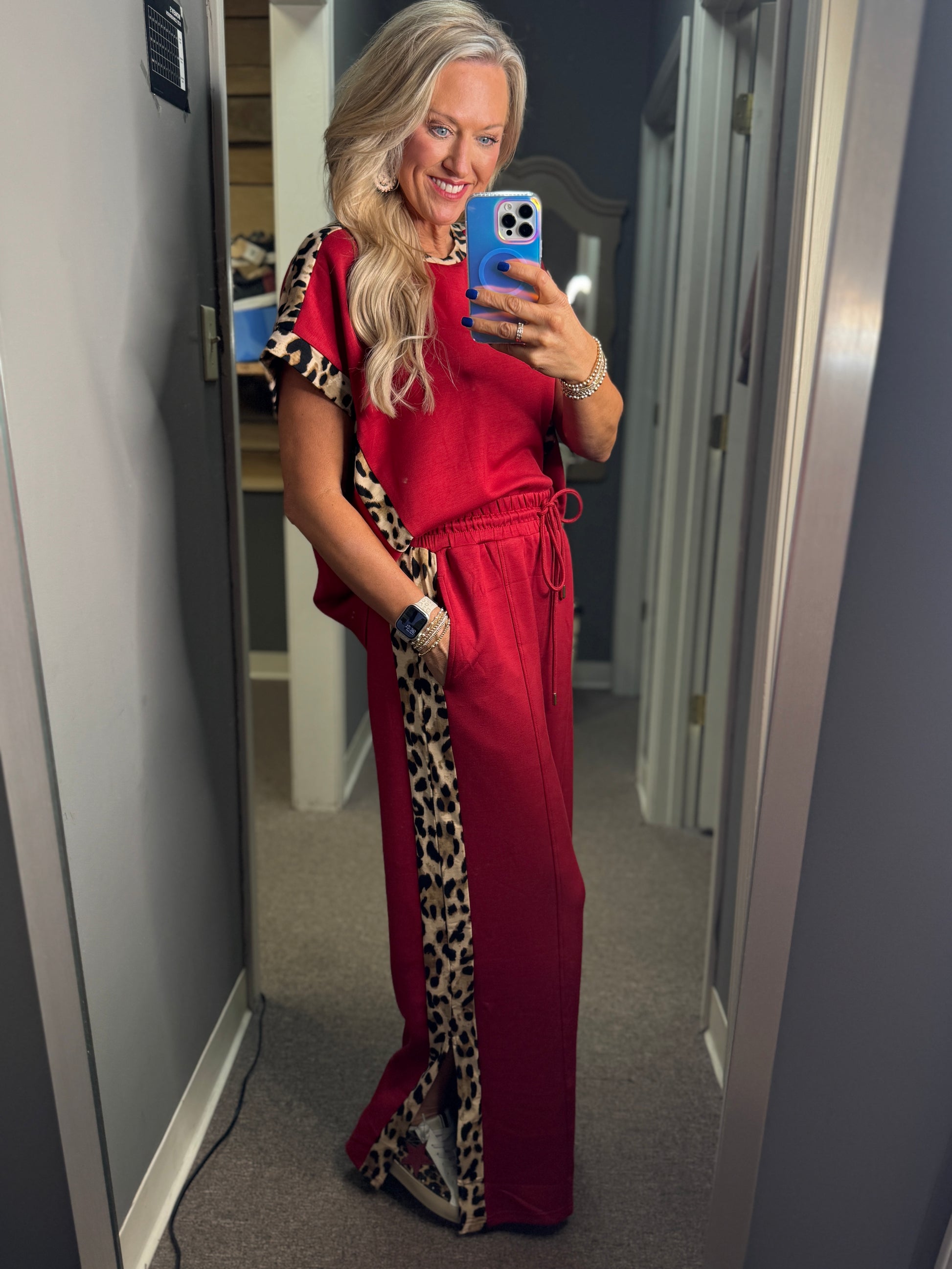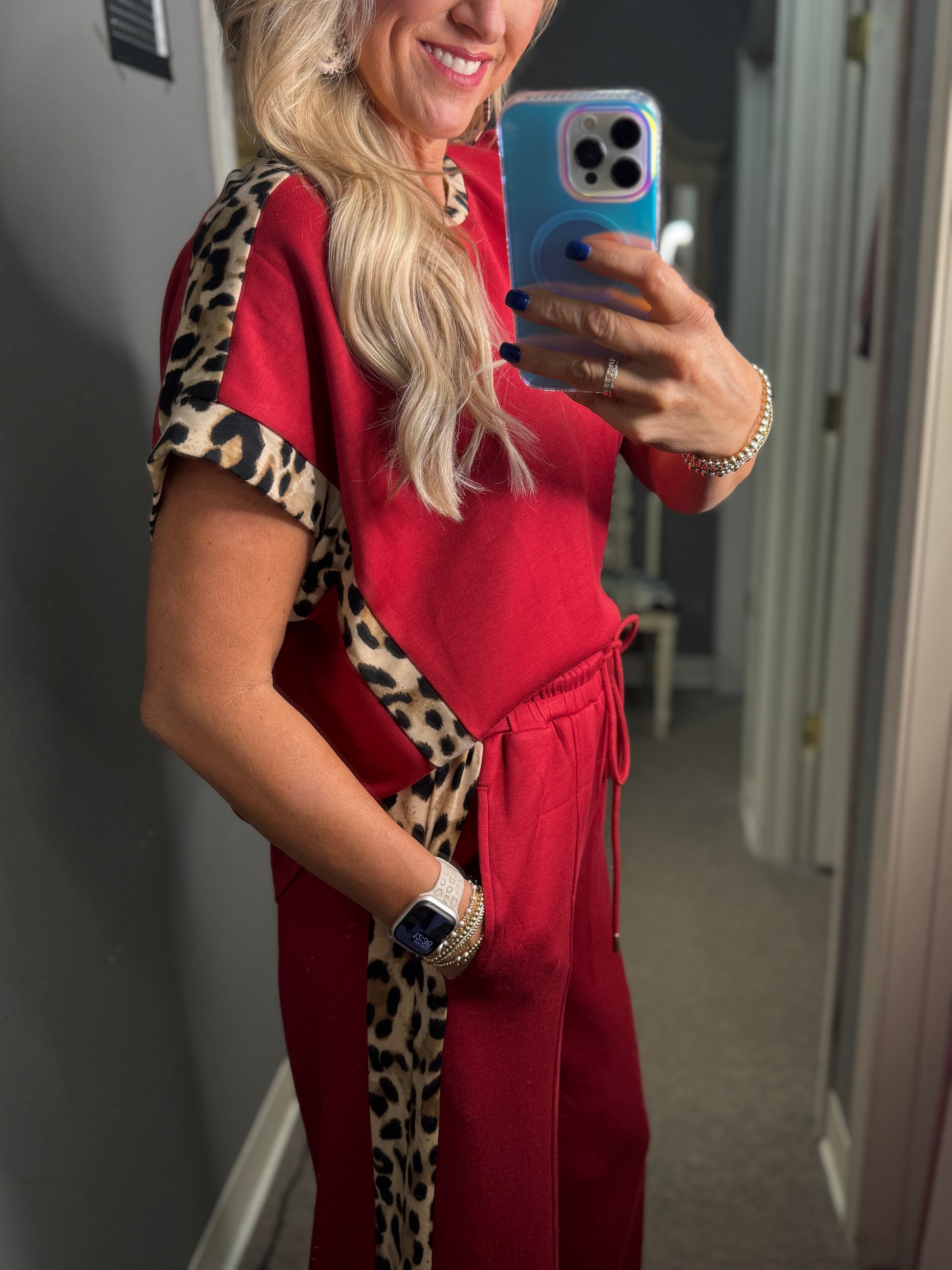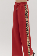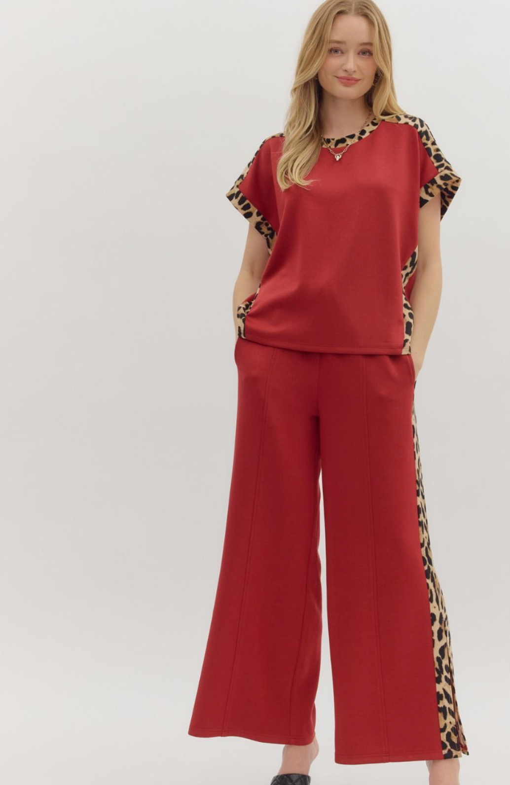 This stylish set combines comfort and bold design with a solid jersey knit short-sleeve top and matching high-waist drawstring pants. Both pieces feature eye-catching leopard pattern accents, adding a trendy touch to a lightweight, non-sheer knit fabric. The elasticated waistband and side pockets on the pants ensure a relaxed fit and practical convenience, making this outfit ideal for effortless everyday wear.