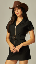 This Belted Stretch Cotton Twill Western Mini Dress combines style and comfort effortlessly. Designed with a sleek zip-up front, a classic collar, and a stylish western yoke, it offers a trendy yet polished look. The short sleeves keep it cool, while the removable belt with a gold buckle allows you to customize your silhouette. Perfect for an evening out, this dress ensures you stand out with confidence and ease.