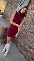 This ribbed sweater dress offers a perfect blend of comfort and contemporary style. Its sleeveless cut and mock neckline create a refined silhouette that's both sophisticated and easygoing. The textured ribbed fabric enhances your natural shape, while the hemline hits just above the knee for flexibility in dressing up or down. Ideal for effortless transitions from daytime activities to evening outings.