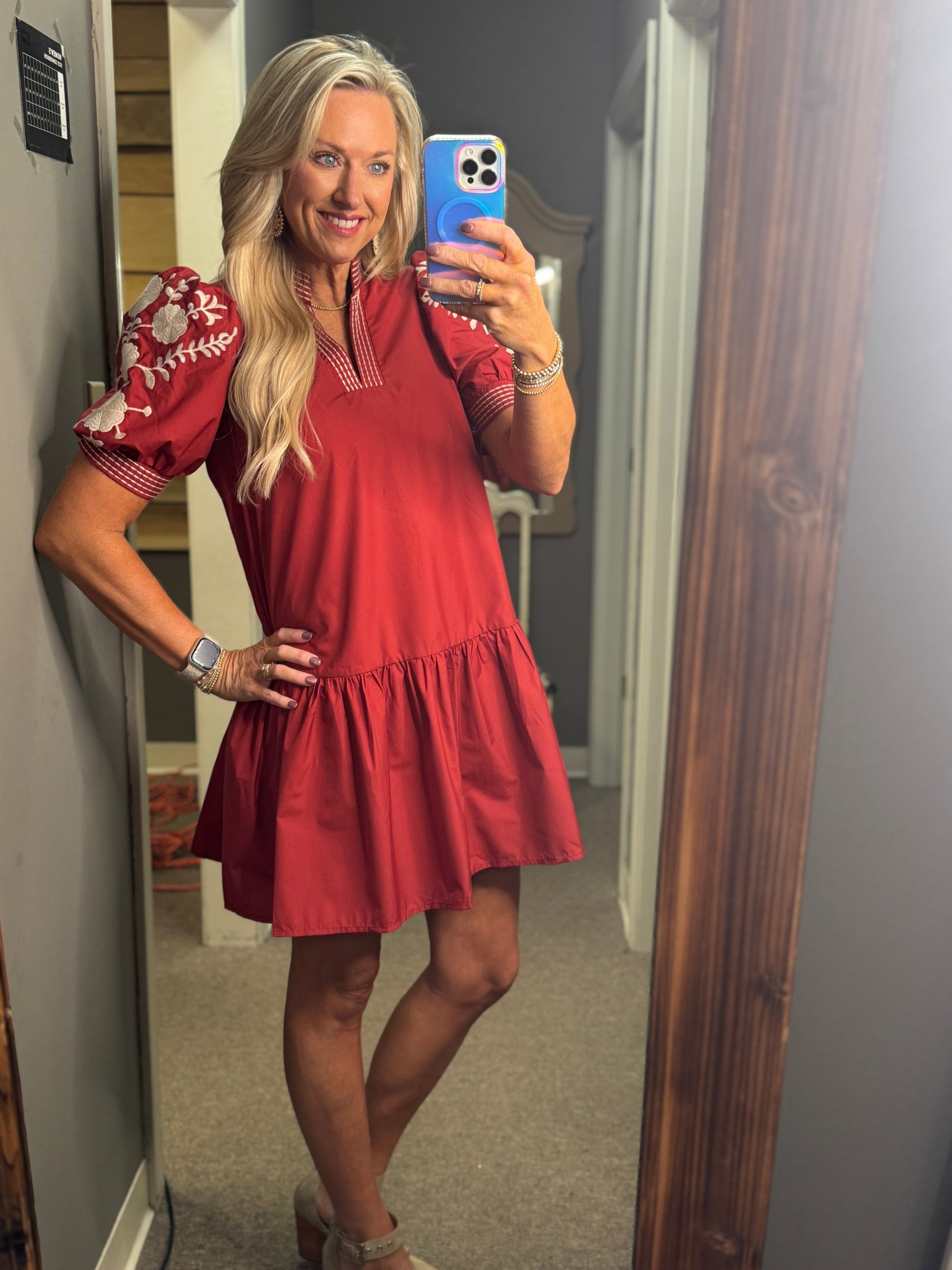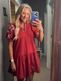 This charming mini dress combines delicate floral embroidery with bold striped trim for a fresh, eye-catching look. Its solid, woven fabric is lightweight yet fully lined, ensuring comfort without transparency. Short puff sleeves and convenient side pockets add playful style and practicality, making it perfect for warm days or casual outings. Embrace effortless elegance and ease in this beautifully crafted dress that stands out with subtle details and flattering design.