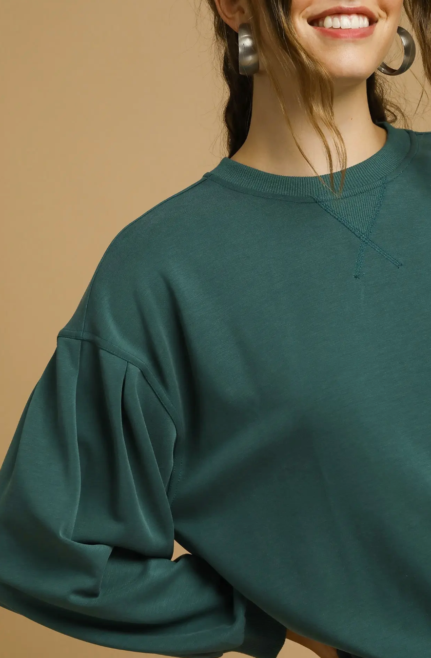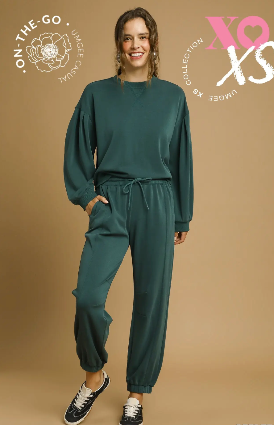 Experience effortless comfort and style with this matching set featuring a pullover sweatshirt and relaxed jogger pants. The pleated sweatshirt highlights gathered puff sleeves and a classic crew neck for a chic touch. The joggers offer an elastic waistband with an adjustable drawstring and convenient side pockets, ensuring an ideal fit and practicality. Perfect for lounging or casual outings, this set combines cozy fabric and modern design to keep you comfortable and trendy throughout your day.