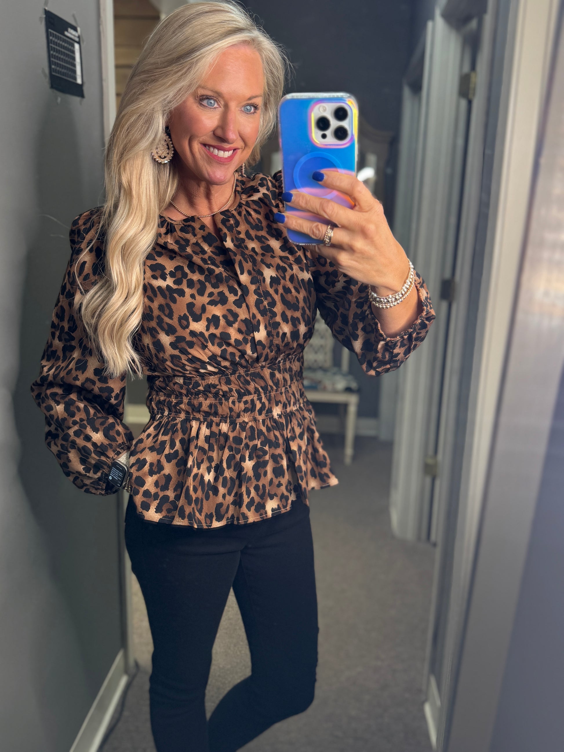 Elevate your wardrobe with this long sleeve woven top featuring a bold leopard print and a flattering waist elastic for a comfortable, cinched fit. The lightweight fabric drapes beautifully, making it perfect for day-to-night wear. Add a touch of wild sophistication to your outfit with this versatile piece that pairs effortlessly with jeans or skirts.