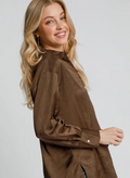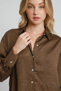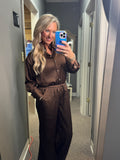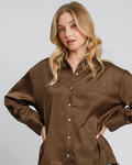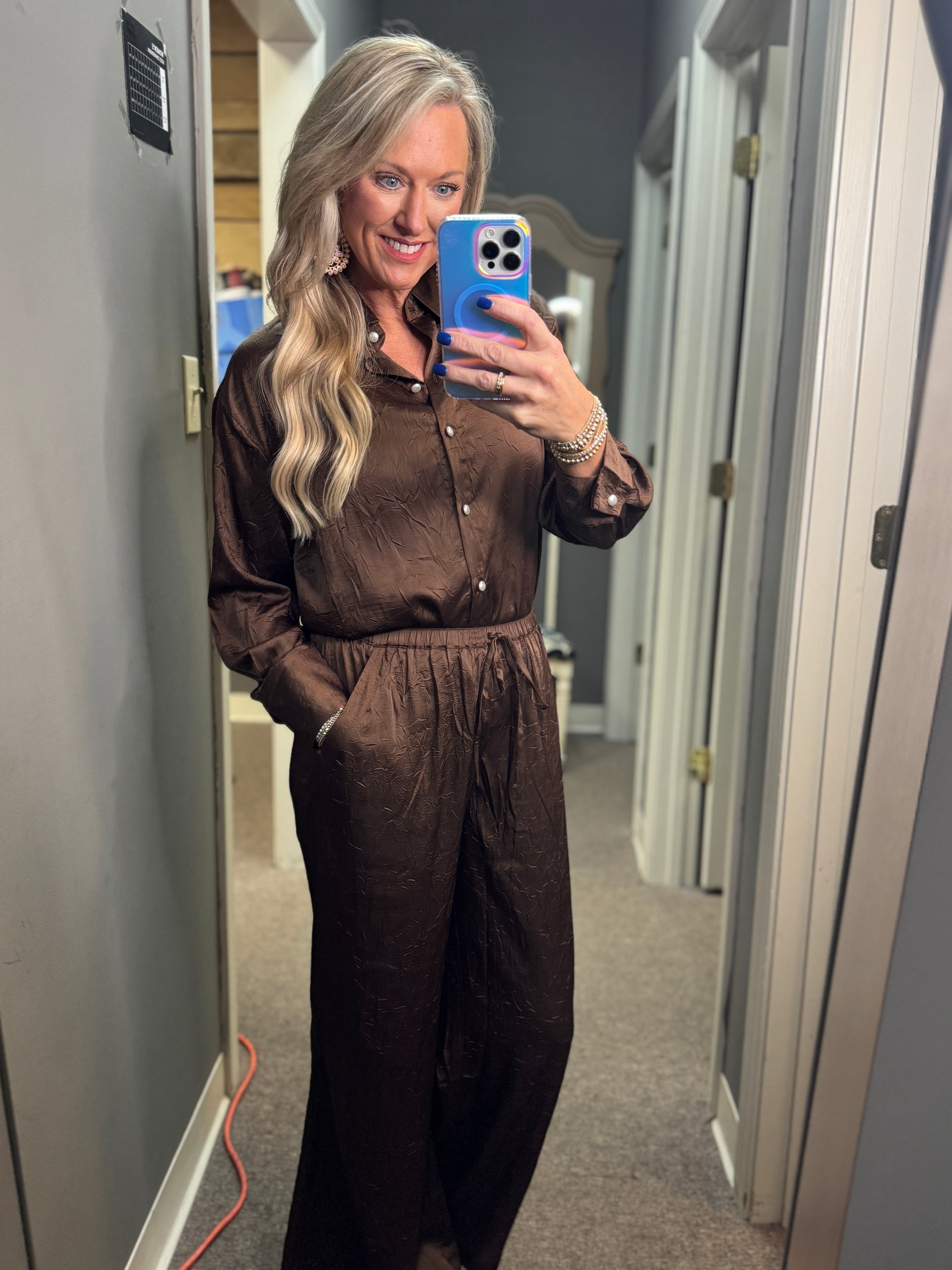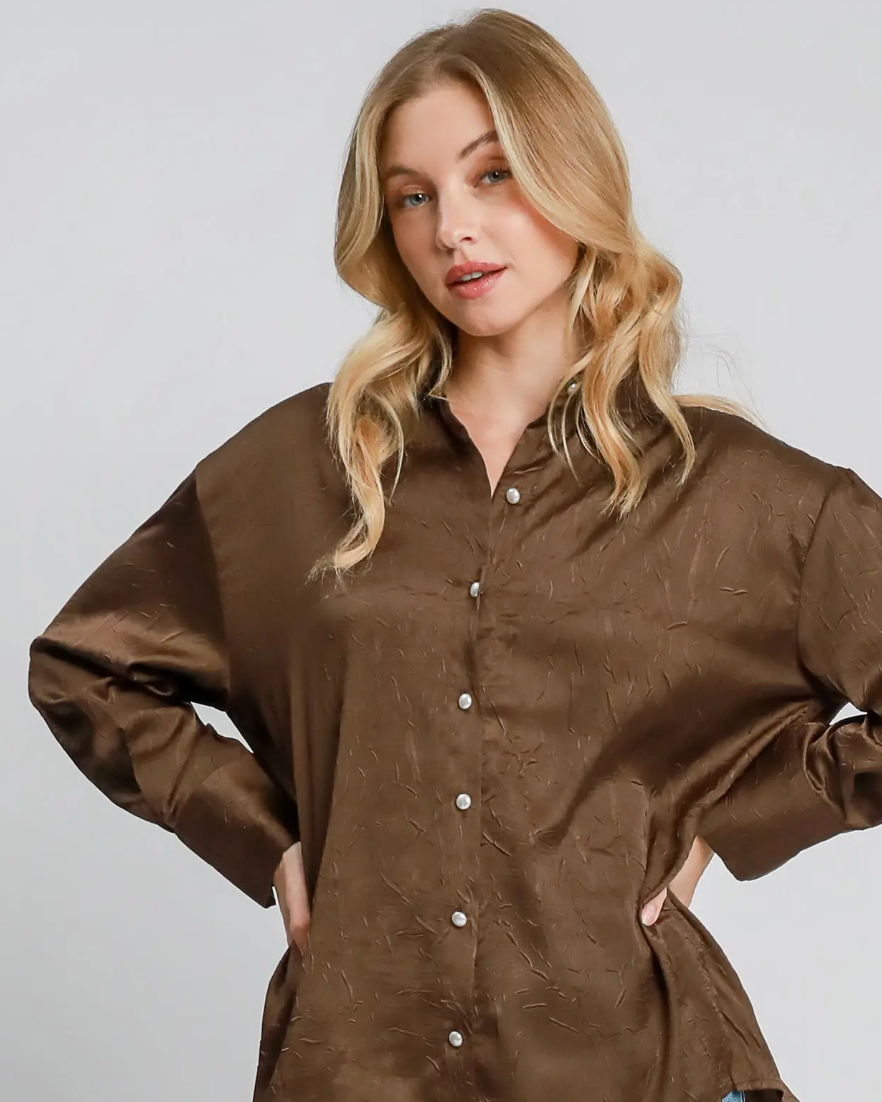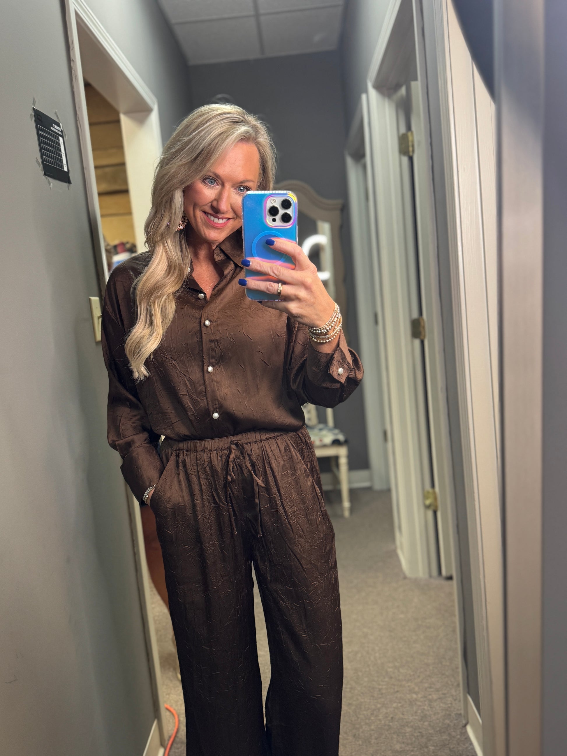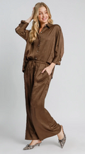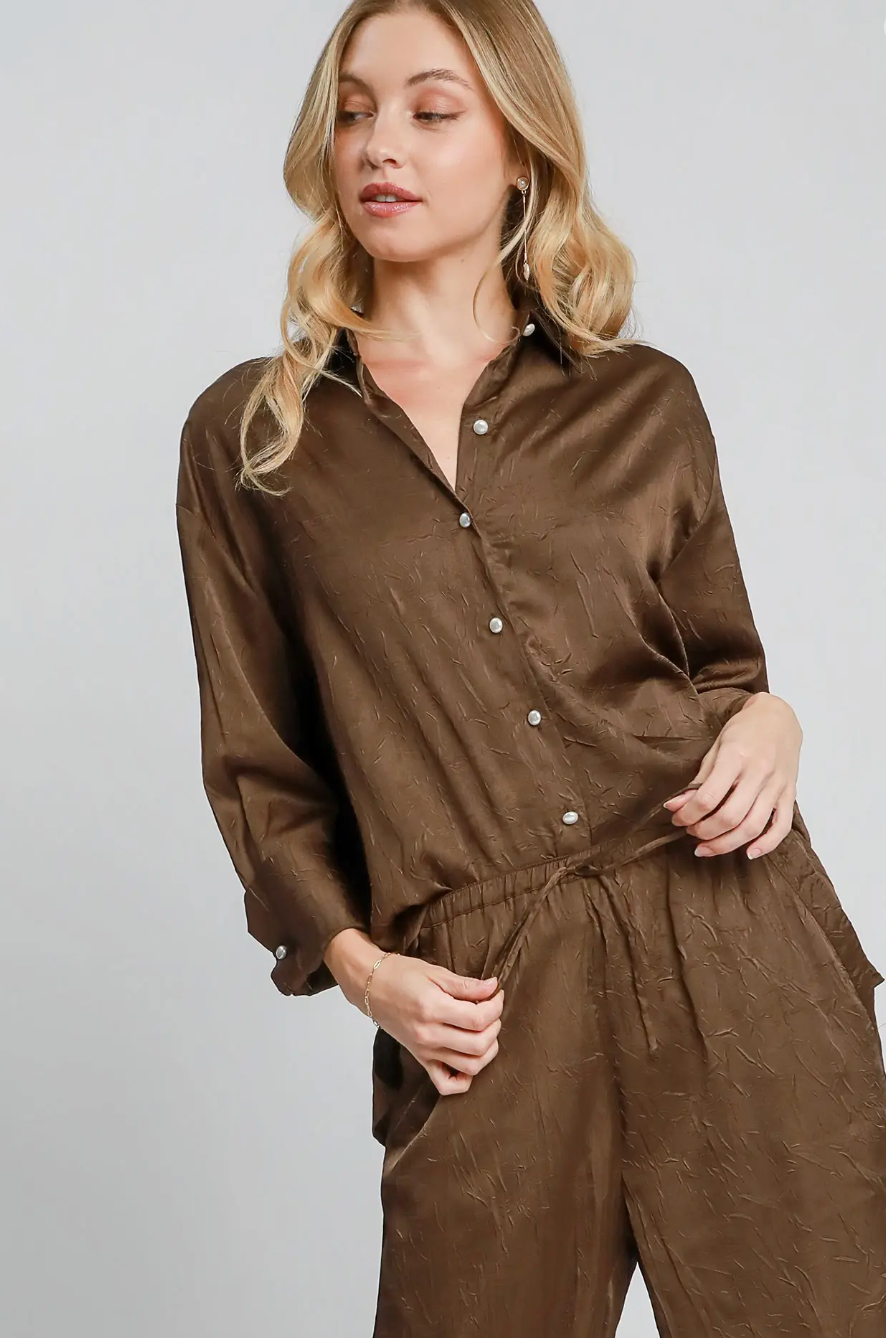 This wrinkle-textured button-down top and pant set offers effortless style with a unique fabric that adds depth and character to your look. The shirt features elegant pearl buttons, elevating everyday wear with a touch of sophistication. Perfect for those who appreciate comfort and refined details, this ensemble combines easy care with standout design for versatile wardrobe appeal.