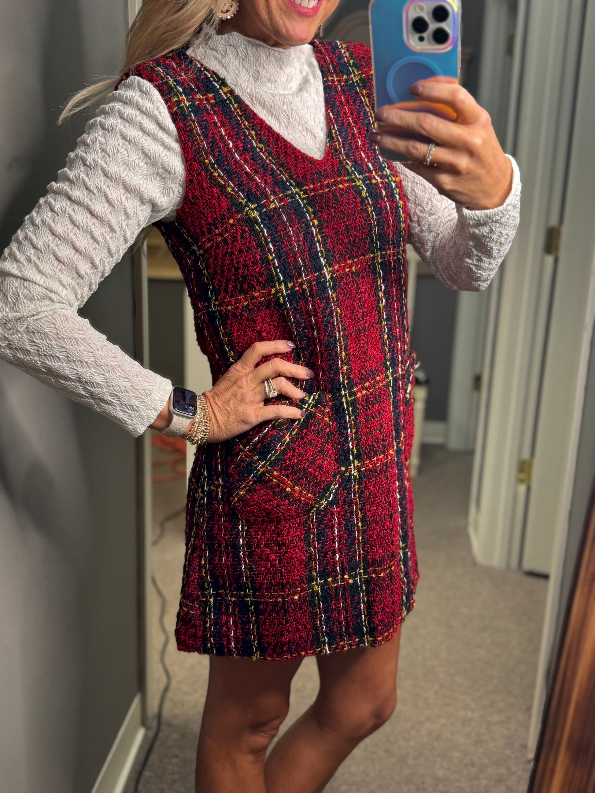 Elevate your wardrobe with this sleeveless checkered plaid tweed dress, featuring a flattering V-neck design. Crafted from textured tweed, it combines classic pattern with modern sophistication, perfect for making a stylish statement at any event. Its sleeveless cut offers ease of movement and pairs effortlessly with layers for versatile wear throughout the seasons.