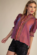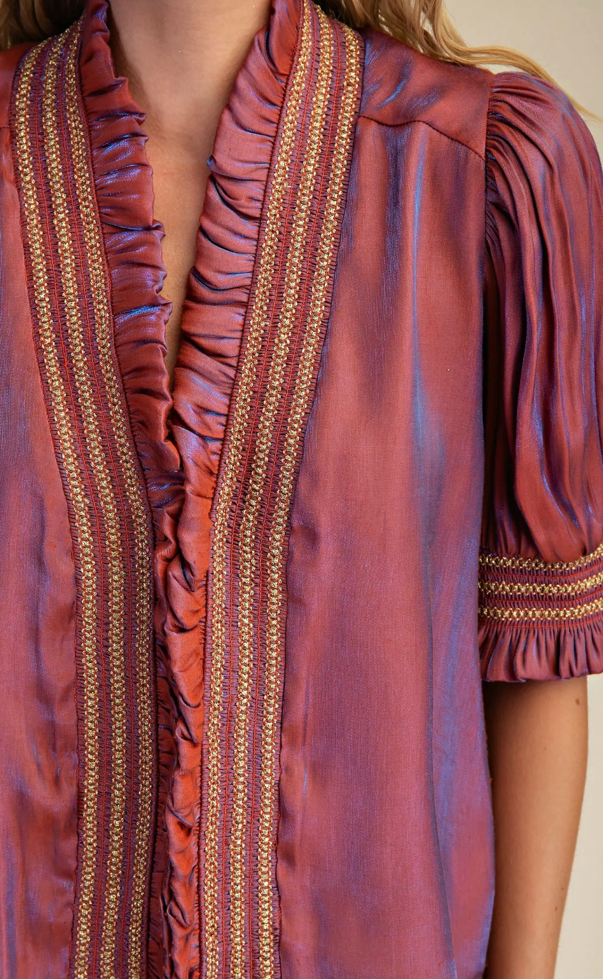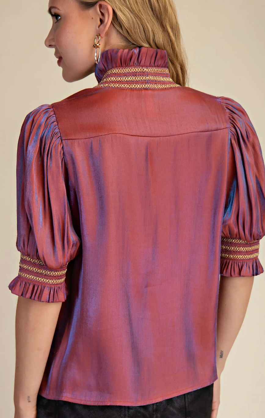 Elevate your wardrobe with this charming Ruffle V-Neck Smocked Puff Sleeve Blouse. The romantic ruffled neckline and voluminous puff sleeves create an effortlessly elegant silhouette, while the smocked detailing adds texture and visual interest. Perfect for dressing up casual outfits or layering under your favorite blazer, this versatile piece transitions seamlessly from day to night. The flattering V-neck draws the eye upward, and the thoughtful sleeve design offers a modern twist on vintage-inspired fashion. Whether you're heading to brunch, the office, or a special occasion, this blouse delivers timeless style with contemporary flair.