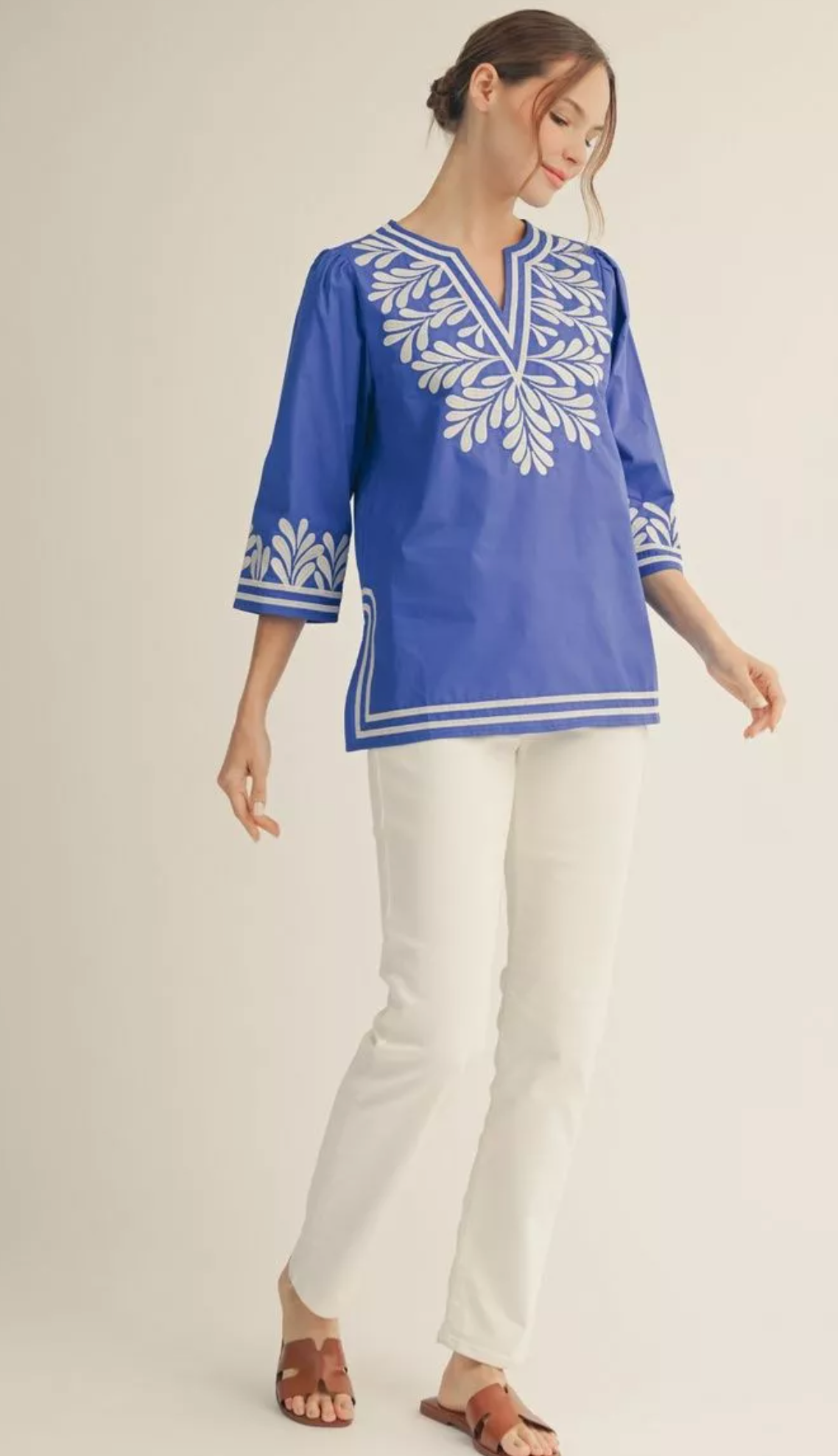 Elevate your everyday wardrobe with this versatile 3/4 sleeve top, designed for effortless style and comfort. The notched V-neckline flatters any frame while the delicate embroidery adds a touch of sophistication. Side slit hems provide subtle movement and a modern silhouette that works beautifully dressed up or down. Perfect for transitional seasons, this piece pairs seamlessly with your favorite jeans, skirts, or trousers for endless styling possibilities.