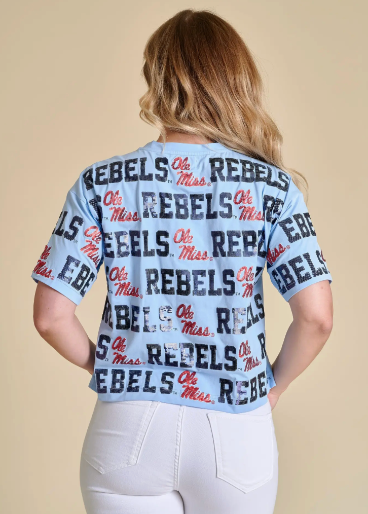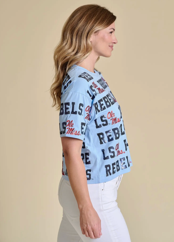 This short sleeve boxy tee takes team spirit to the next level, with a full repeat of sequin wordmarks and logos across the front and back. Cut in a relaxed silhouette, it’s the definition of cool-meets-chic. We’re styling it with a sequin mini and chunky bangles for added glam, or oversized with biker shorts and a crossbody bag for effortless edge. Why We're Obsessed: -Relaxed t-shirt fit with a boxy silhouette -Full sequin repeat of logos + wordmarks on both sides -Lightweight and unlined for easy layering -Feels like a tee, looks like a statement Material: 100% Cotton Jersey Care: Machine wash dark colors separately.
