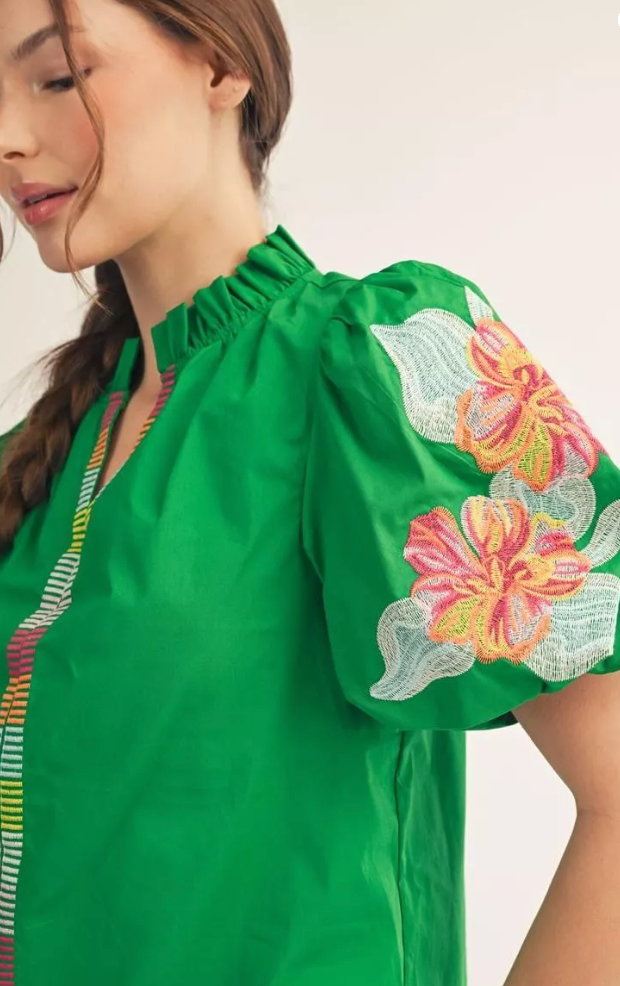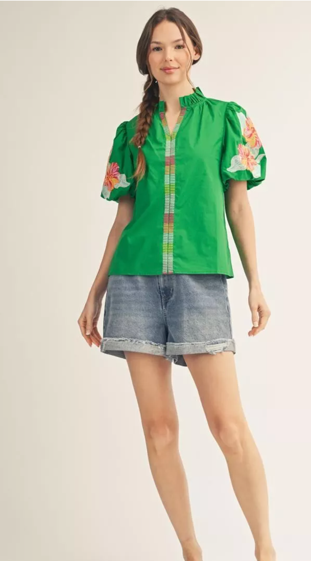 Elevate your everyday wardrobe with this charming puff sleeve top, designed to turn heads with its notched V-neckline and delicate ruffled trim. The intricate embroidery accent adds a touch of sophistication and personality, making it perfect for both casual outings and dressed-up occasions. The structured puff sleeves create a flattering silhouette while maintaining comfort throughout the day. Whether paired with jeans or tailored trousers, this versatile piece brings effortless elegance to any look.