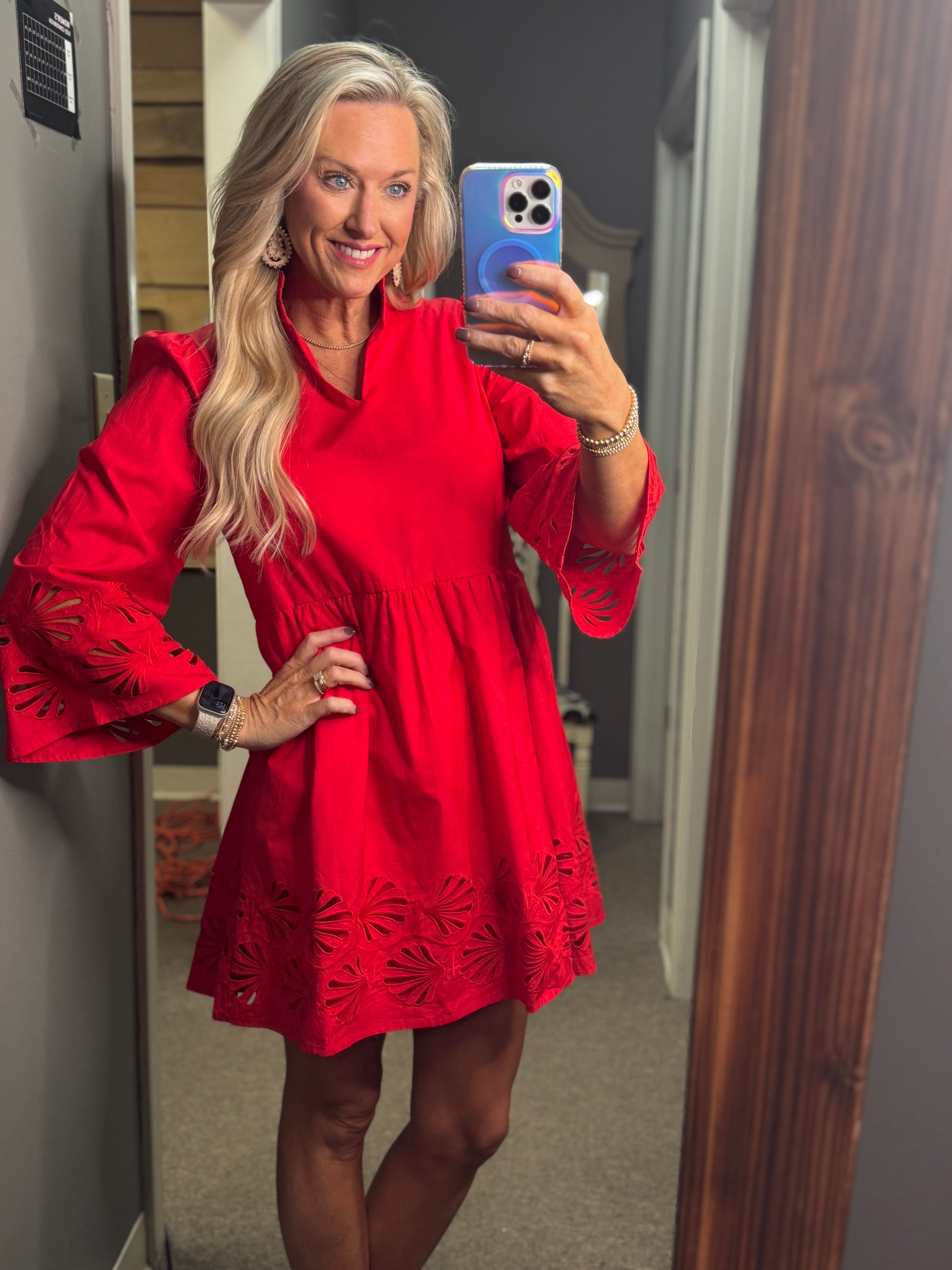 This elegant dress features 3/4 sleeves and a high ruffled neck for a sophisticated look. Delicate eyelet accents add a touch of charm, while convenient side pockets provide practical style. Perfect for both casual and formal occasions, it combines comfort with timeless design to elevate your wardrobe effortlessly.
