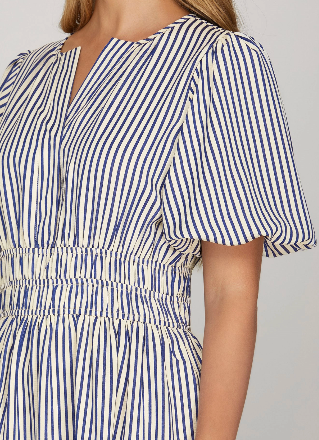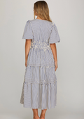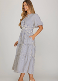 Elevate your wardrobe with this stunning midi dress that effortlessly combines style and comfort. Featuring romantic puff sleeves and delicate pintuck detailing, the tiered stripe design creates flattering dimension while the elastic waistband ensures a perfect fit all day long. Practical pockets add everyday functionality to this versatile piece. Whether you're heading to brunch, a casual date, or weekend gatherings, this woven dress transitions seamlessly from day to night. The thoughtful construction and on-trend silhouette make it a must-have addition that works harder than it looks.