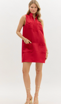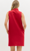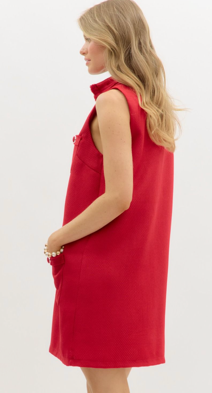 This eye-catching sleeveless mini dress combines style and comfort with its distinctive textured fabric and raw edge detailing. The high neck band with front zipper closure creates a sleek silhouette, while convenient patch pockets add practical functionality. Fully lined for a smooth fit, this lightweight woven piece transitions effortlessly from day to night. The non-sheer fabric ensures confidence with every wear – perfect for making a statement at your next event.