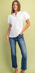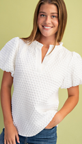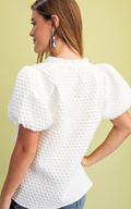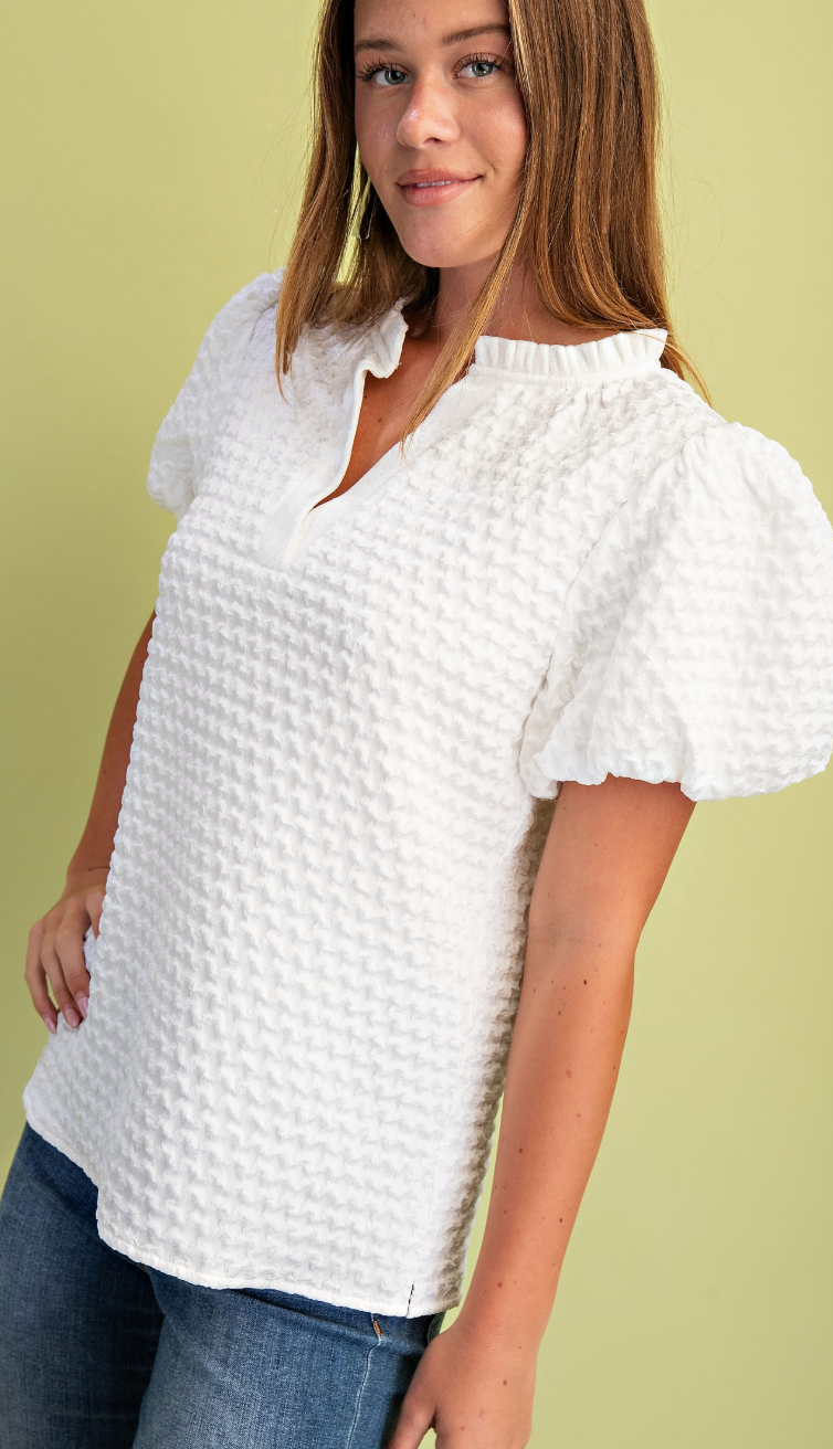 Elevate your wardrobe with this textured puff sleeve top, featuring a delicately ruffled V-neckline accented in soft velveteen. Its unique blend of textures adds depth and sophistication, while the puff sleeves create a flattering, stylish silhouette. Perfect for dressing up or down, this top brings effortless charm to any outfit.
