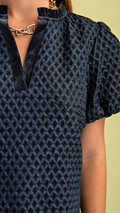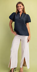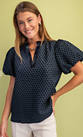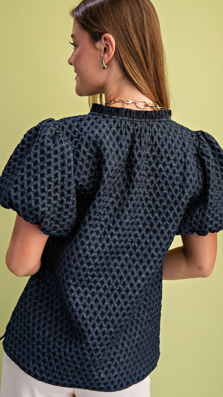 Elevate your wardrobe with this textured puff sleeve top featuring a delicate velveteen-accented ruffled V-neck. The unique combination of fabric textures adds depth and charm, while the flattering V-neckline and puff sleeves create an effortlessly stylish and feminine silhouette. Perfect for both casual days and dressier occasions, this top offers versatile elegance to enhance any outfit.