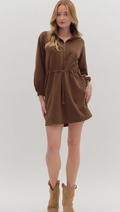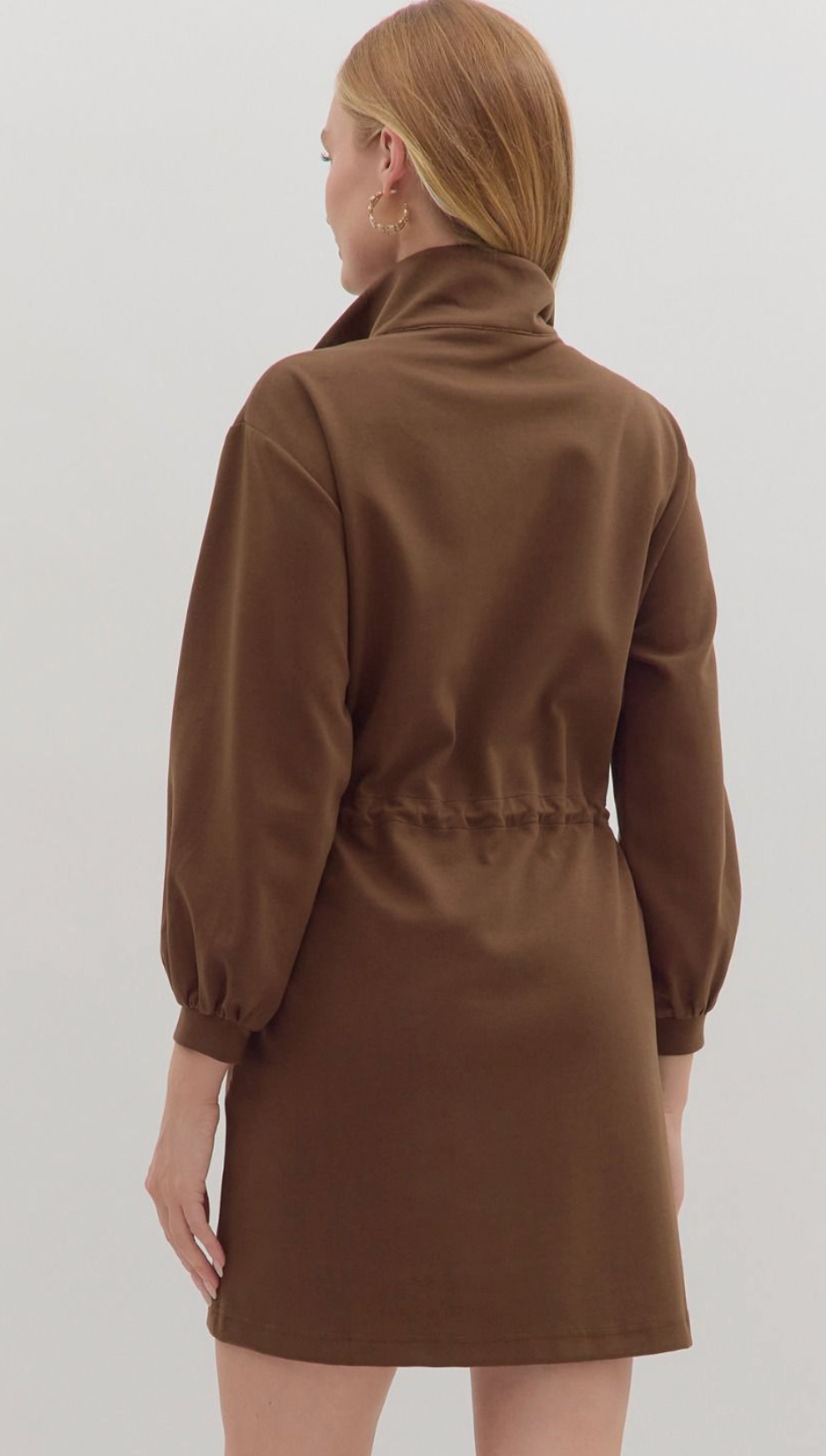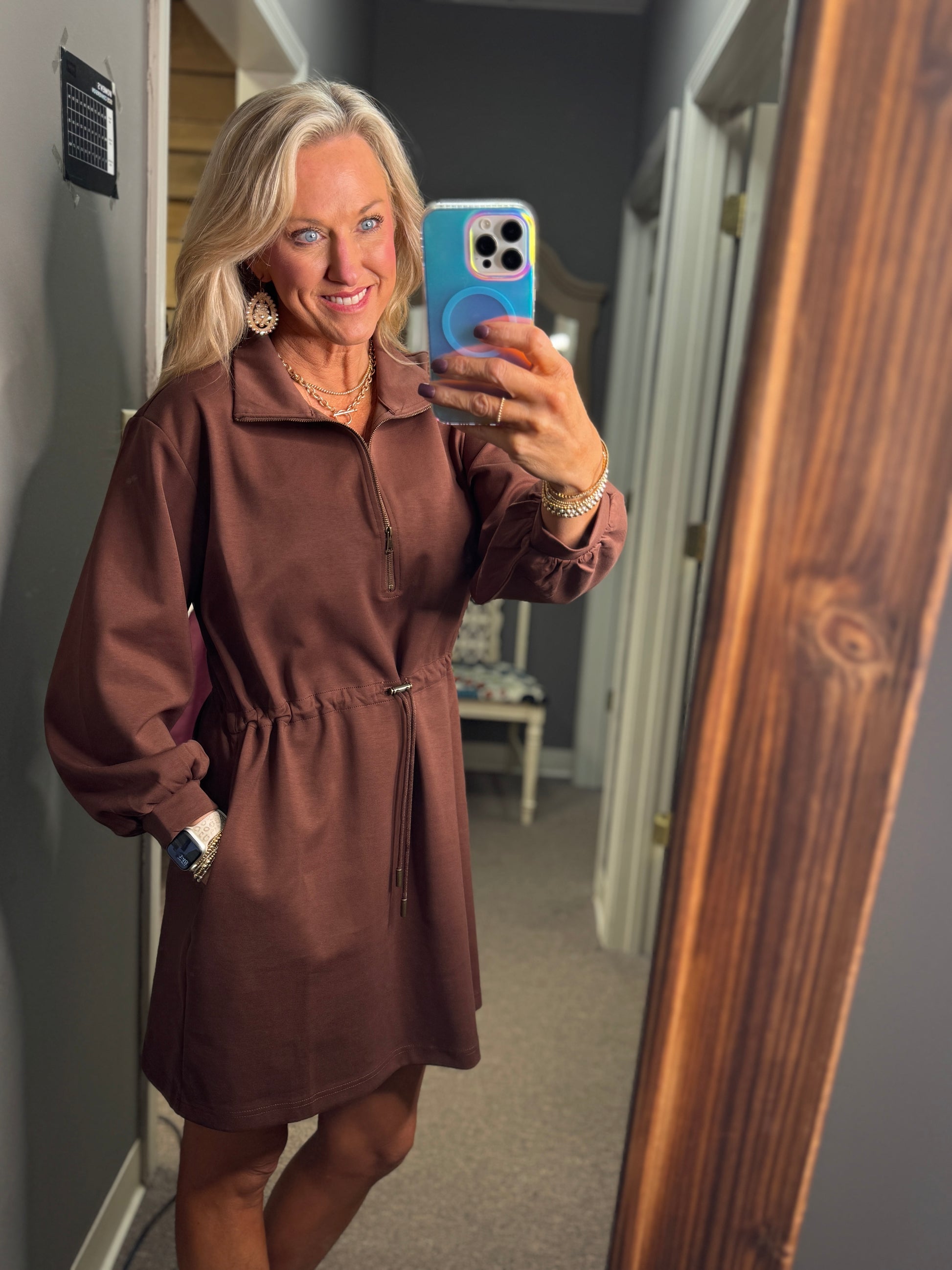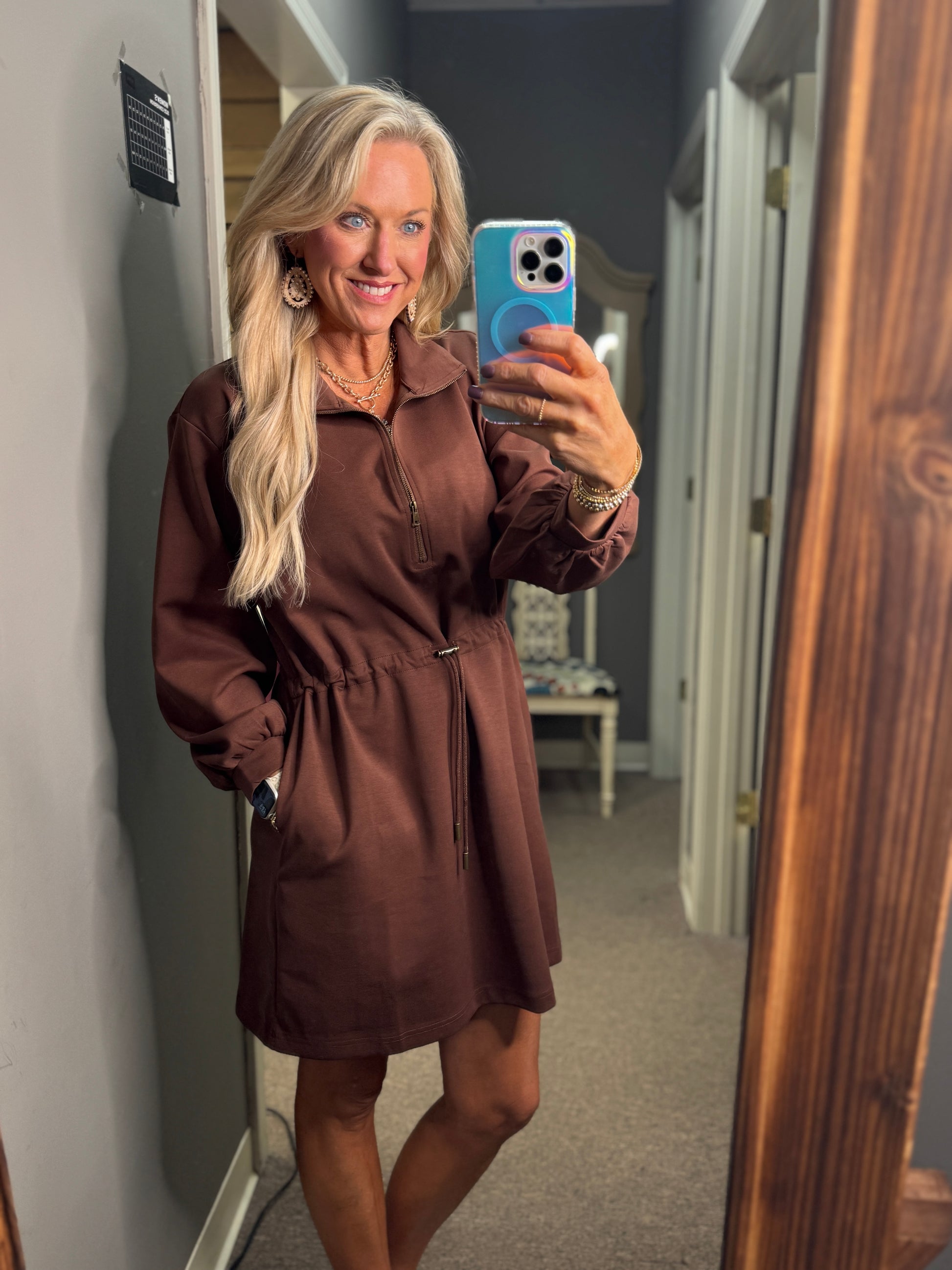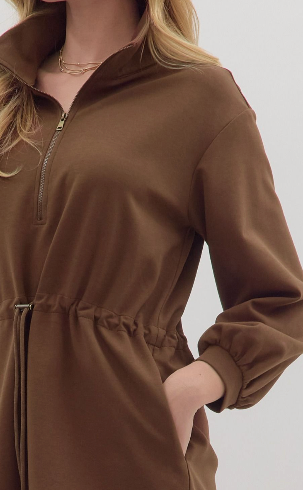 This solid long sleeve mini dress combines comfort and style effortlessly. Featuring a convenient half zip front and an adjustable drawstring waist, it allows you to customize your fit for flattering silhouette. Crafted from medium-weight knit fabric, it offers a cozy feel without being sheer. Side pockets add practicality, while the unlined design ensures breathability. Perfect for casual outings or layering, this dress balances ease and chic in one versatile piece.