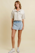 Our Zip Up Denim Wrap Skort is a chic and edgy addition to your wardrobe. Designed by Cloud Ten, this piece pays homage to the modern contemporary woman. This skort offers the comfort of shorts with the style of a skirt, making it a versatile piece for any occasion. Whether you're following trends or starting them, our denim wrap skort is a must-have. From design to production, we put the utmost care into every step to bring this creation to life.